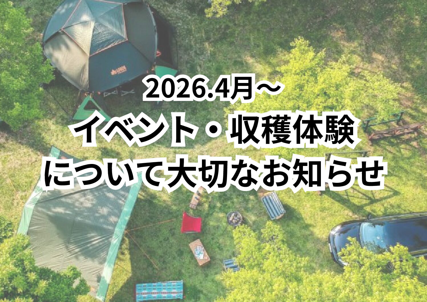 木々に囲まれて区画されたサイトと、充実した設備、各種クラフト体験や収穫体験など様々なイベントをご用意し、 スタッフ一同、皆さまのお越しをお待ちしております。日帰りでも、イベントや収穫体験など楽しめます。