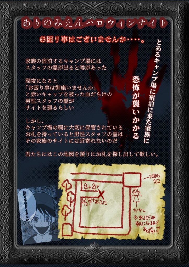【ハロウィンナイト】10月毎週土曜日開催ハロウィンナイトの日にだけ現れるキャンプ場の愉快なお化け達!!コースをクリアして景品を貰おう。
