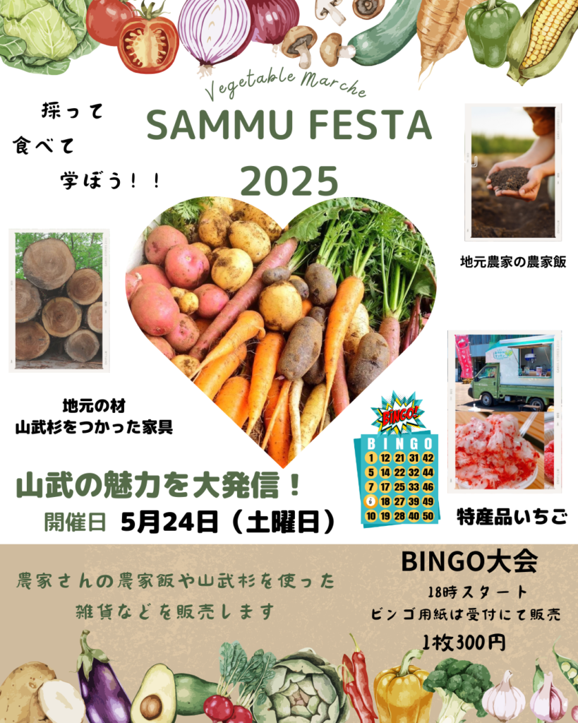 5月SAMMU FESTA 5/24(土)山武の特産品を集めた魅力発信イベント!!農家飯×山武杉BINGO大会5月月24日開催予定17時30分~