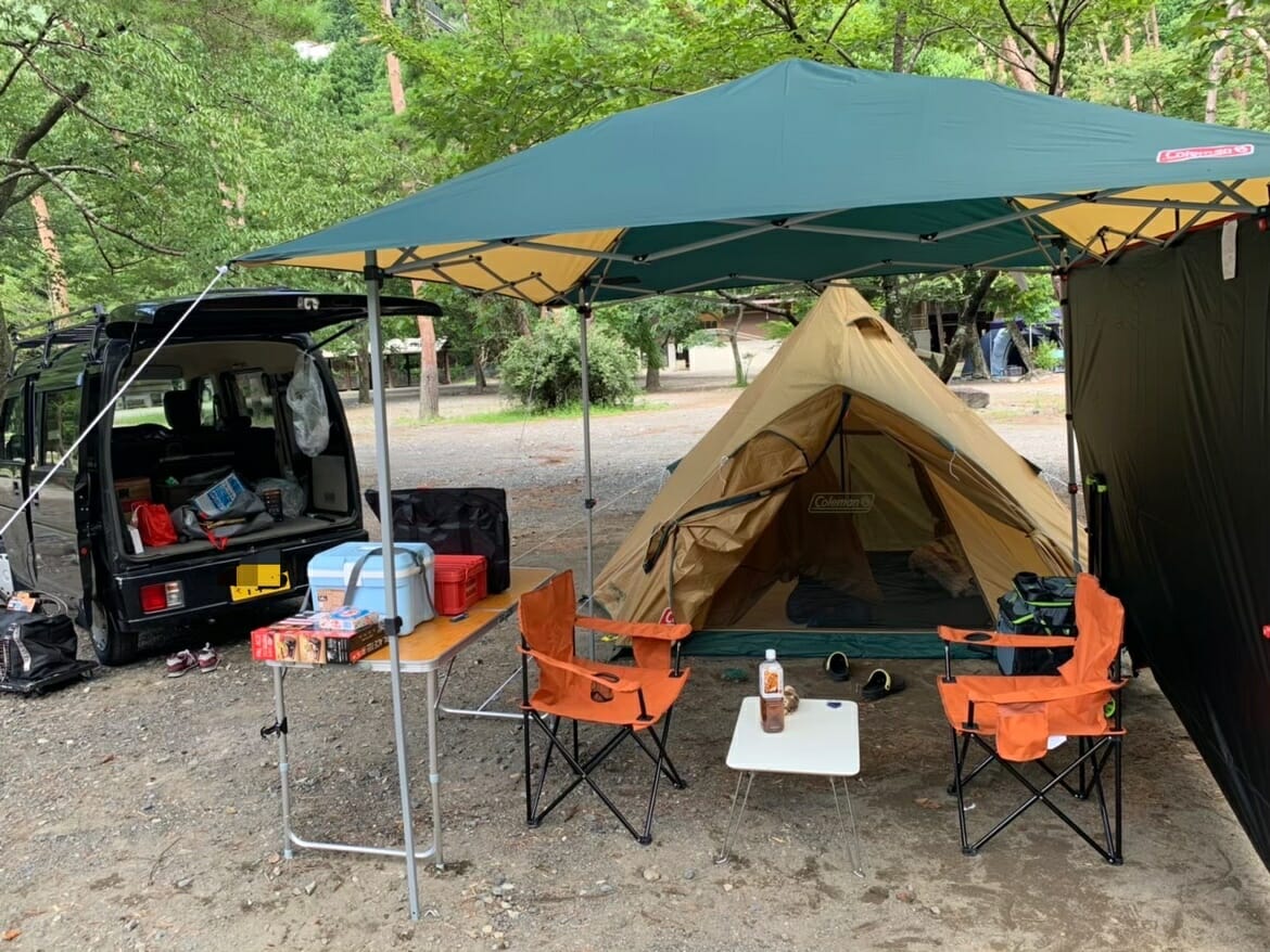 車のバックドアを開けて屋根代わりにもできるので、雨に濡れる時間を極力抑えることができ、帰宅後のメンテナンスのことを考えても、オートキャンプの利便性は抜群です!