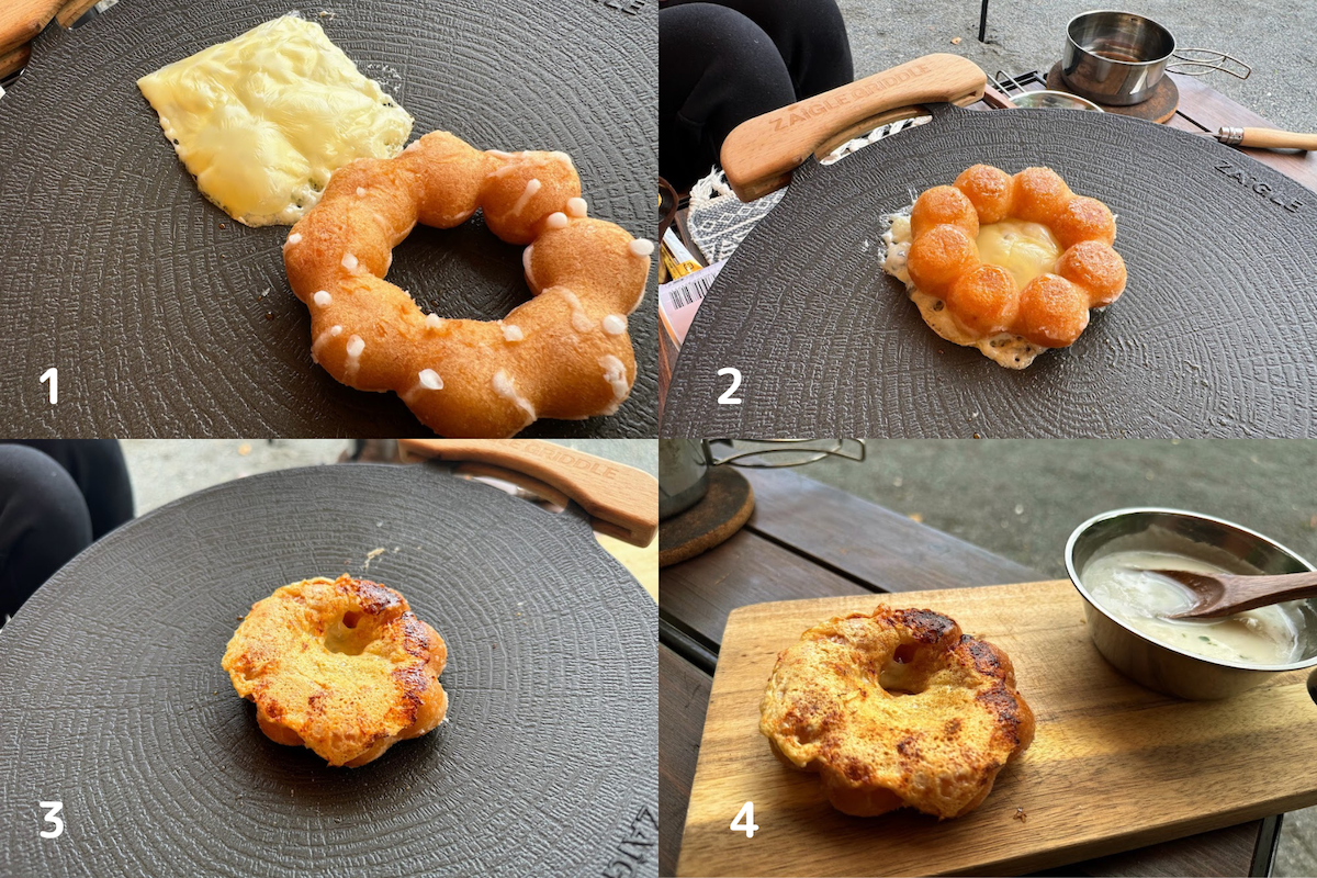 2. ポン・デ・リングの焼いた面を下にしてチーズにのせ、チーズと一緒に焼いていく