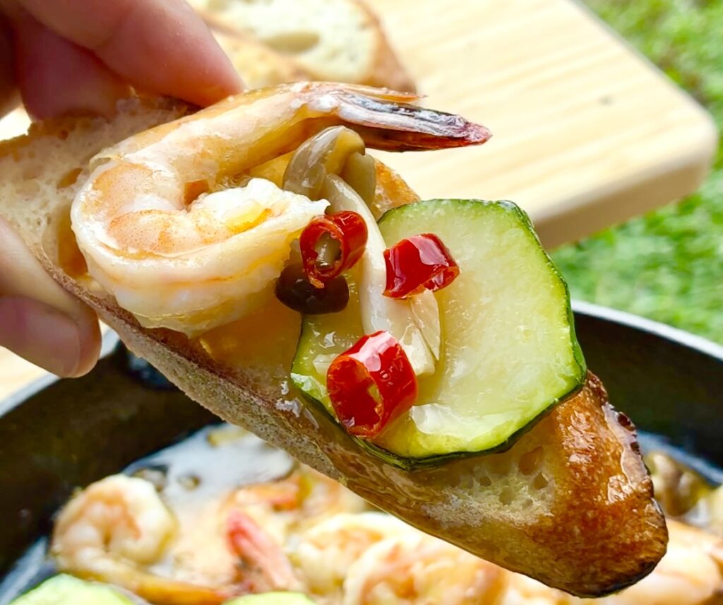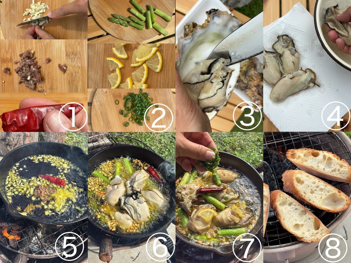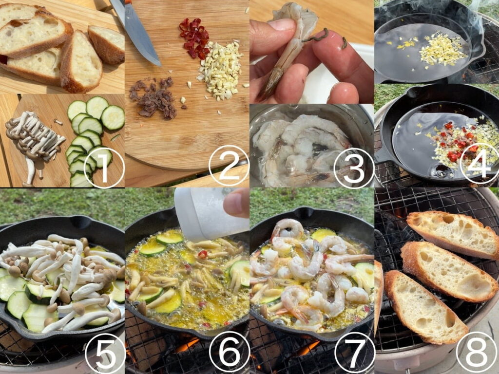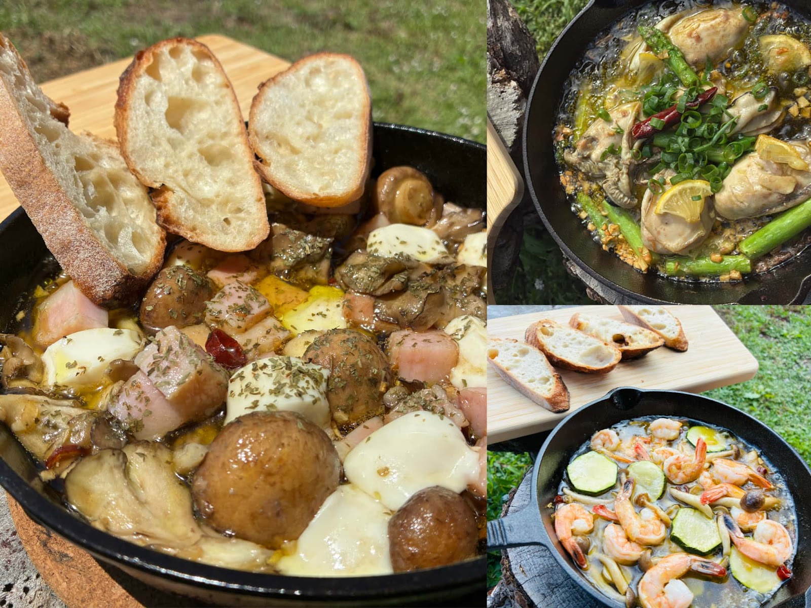 【 焚き火でつくるアヒージョ3選(牡蠣・えび・キノコ)】