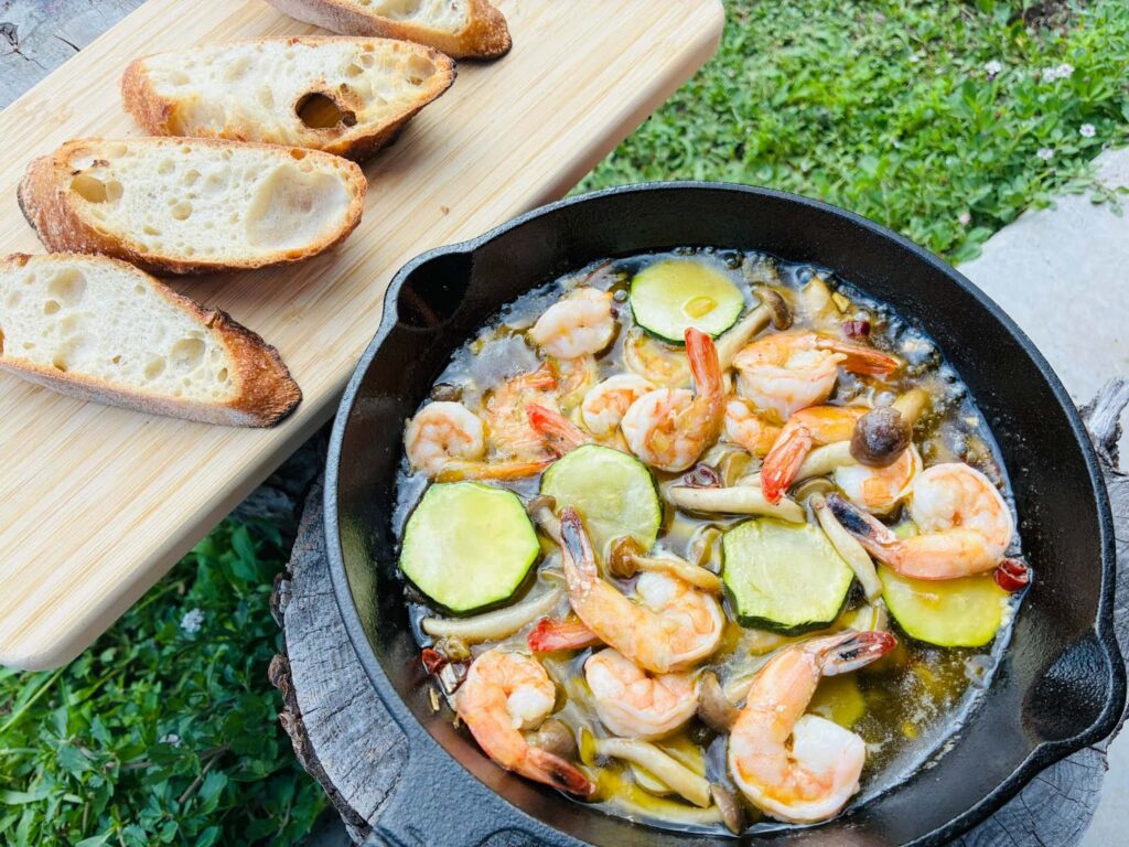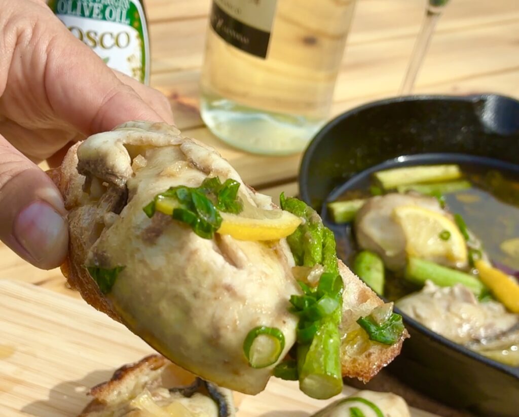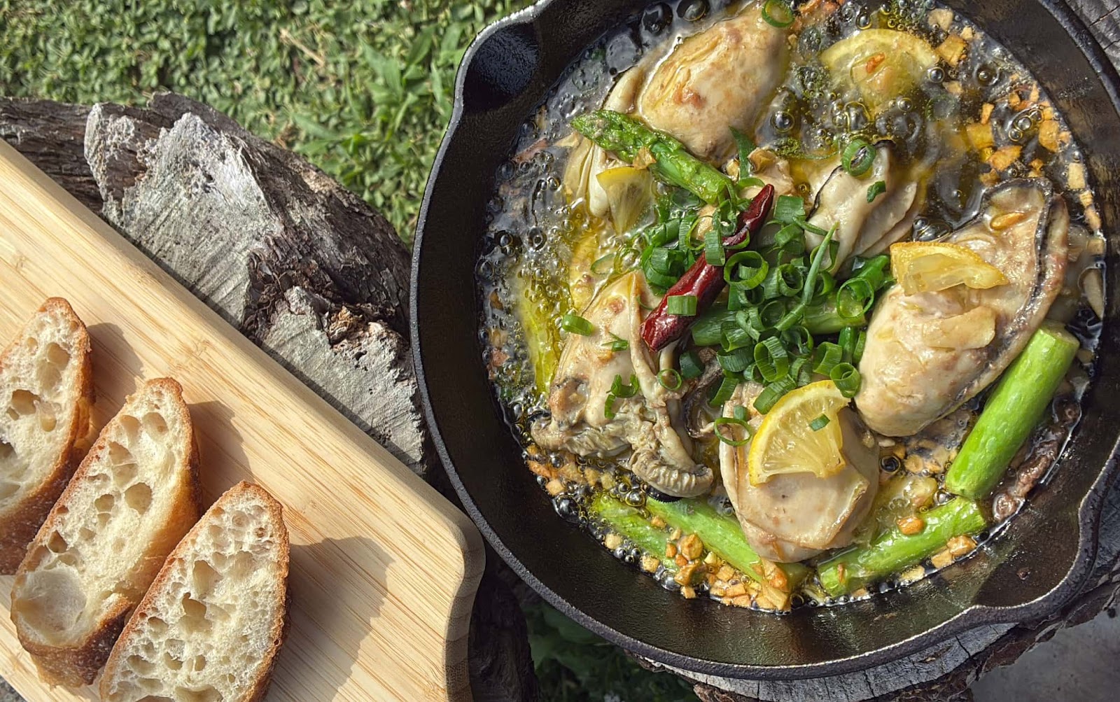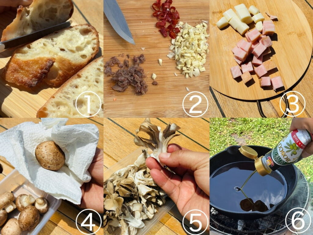 【 焚き火でつくるアヒージョ3選(牡蠣・えび・キノコ)】