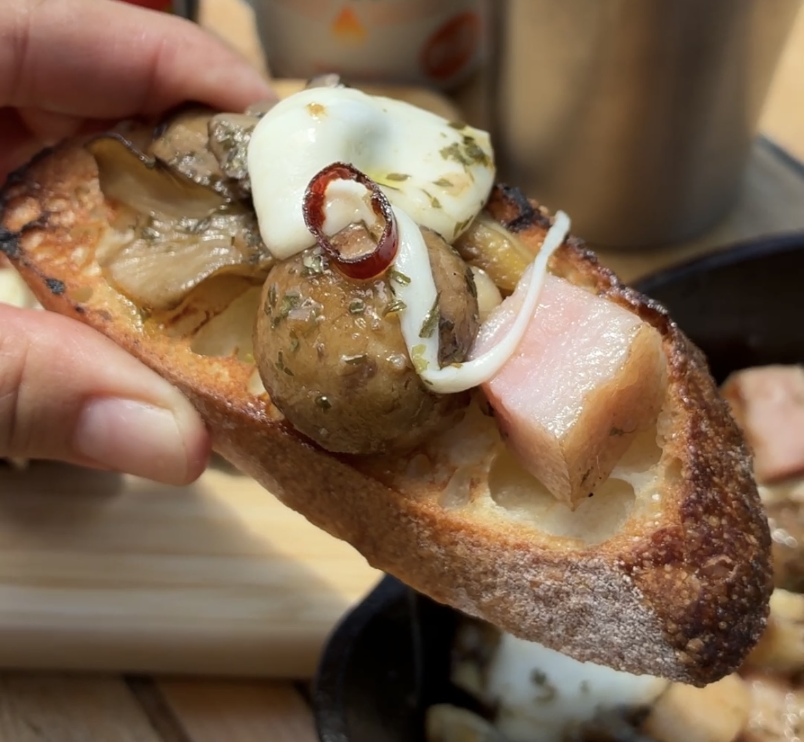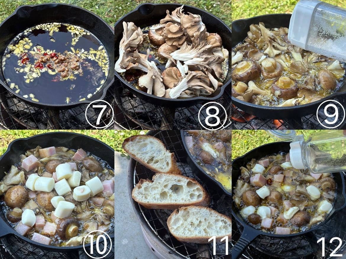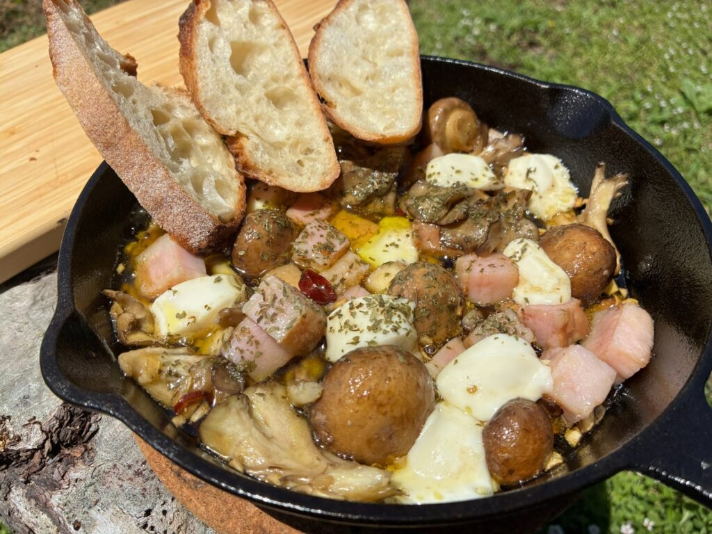にんにくが香り立つオリーブオイルが具材にしっかりと染み込み、そこにキノコとベーコンの旨味が合わさったとても贅沢なキャンプ飯です。