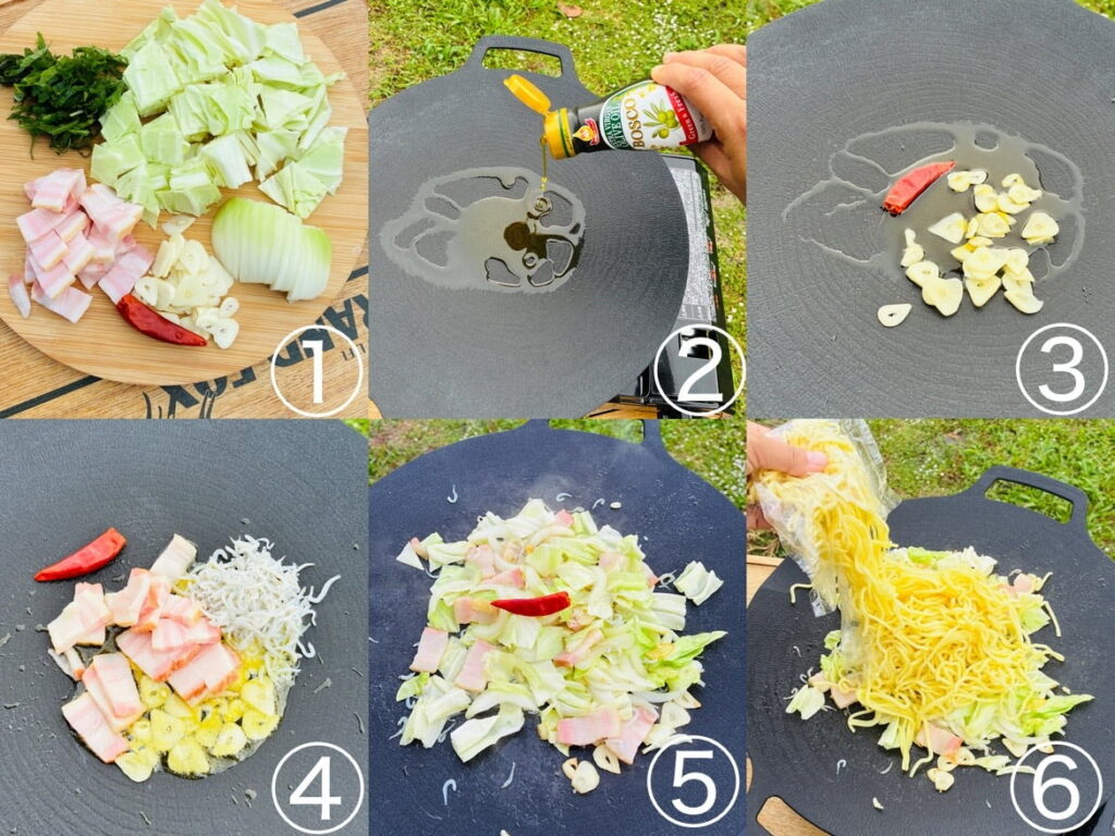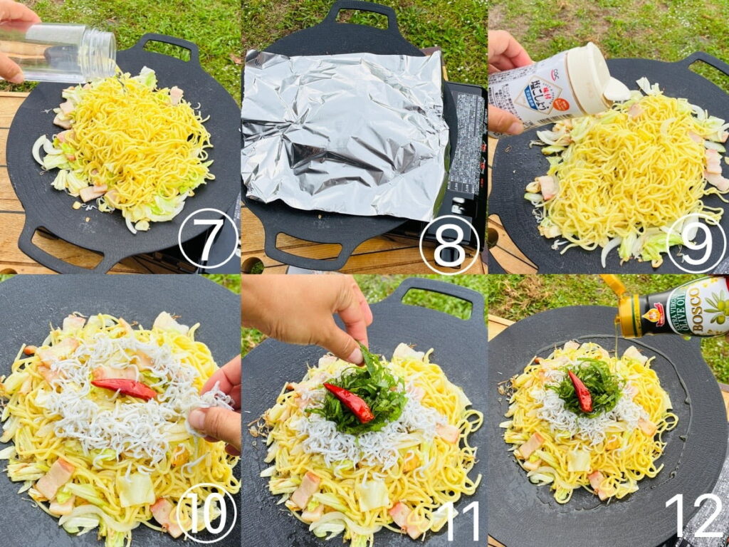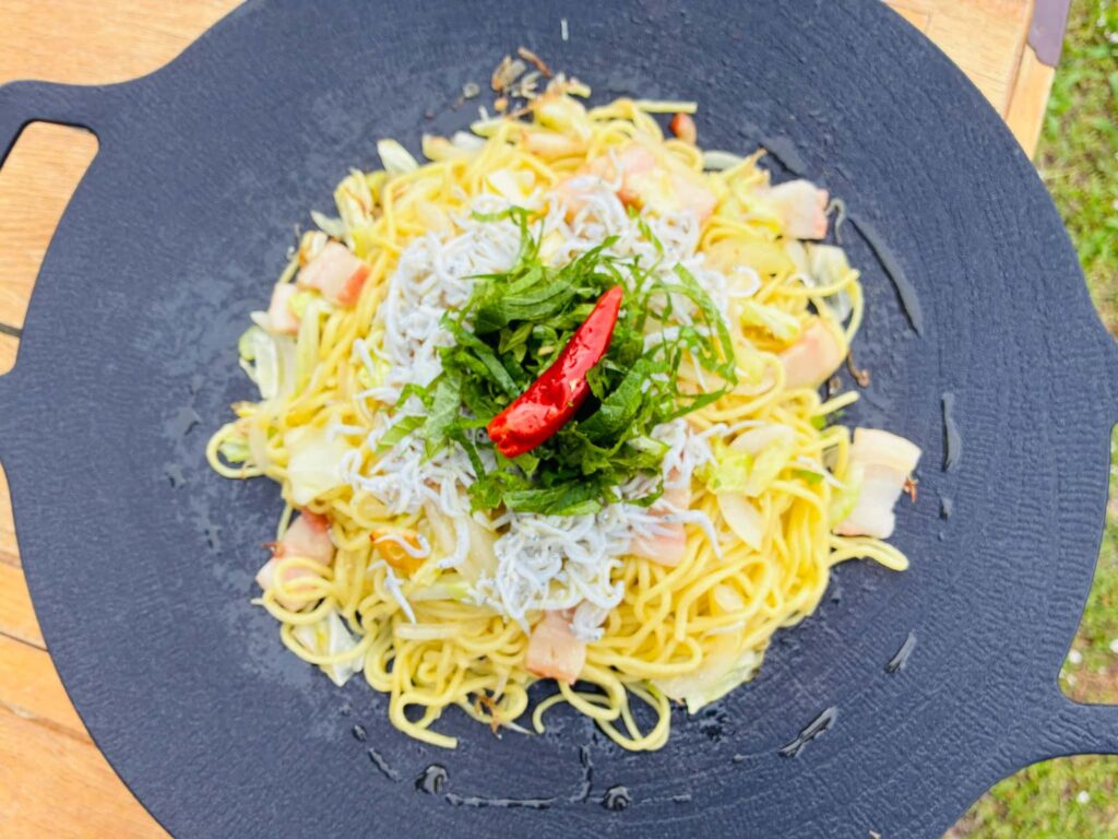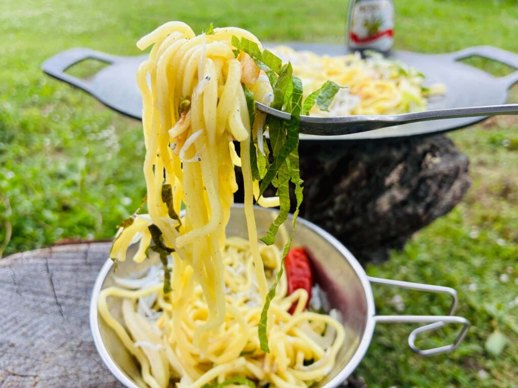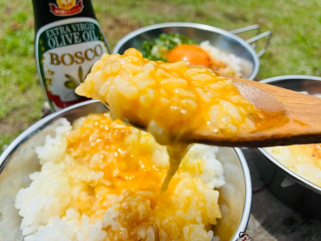 BOSCOエキストラバージンオリーブオイルを加えることで、塩気の効いたしらすの旨味が引き立ち、満足感のあるキャンプ飯になりました。