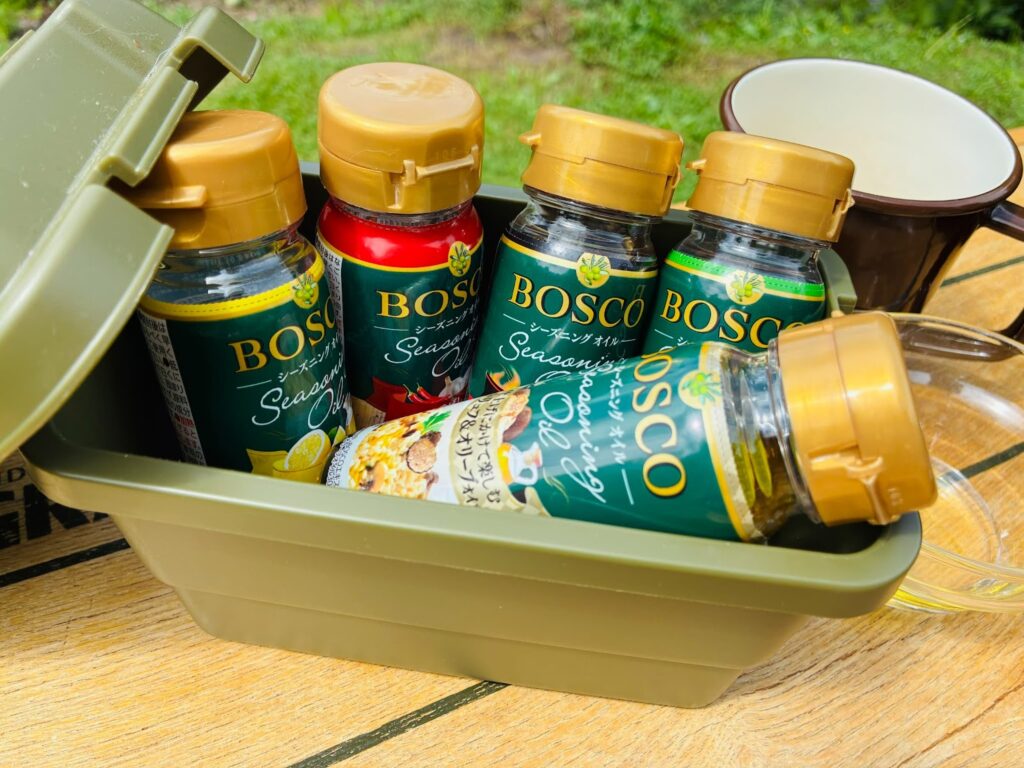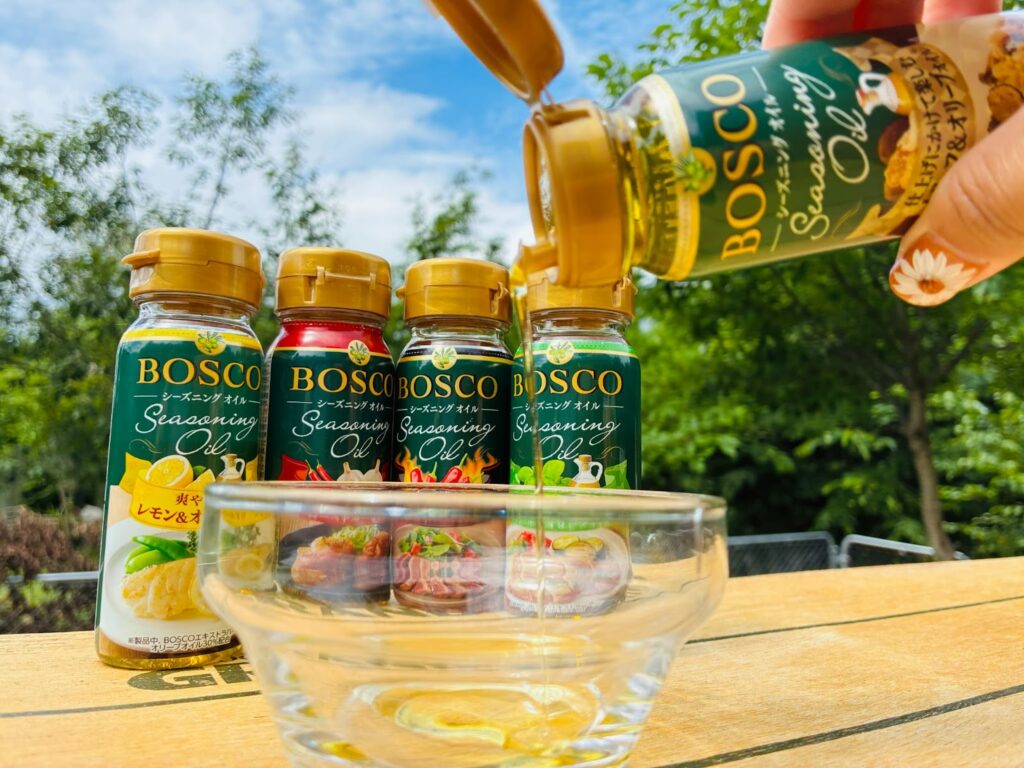 日清オイリオのBOSCO シーズニングオイルは、キャンプ飯のハードルを一気に下げる万能調味料です。