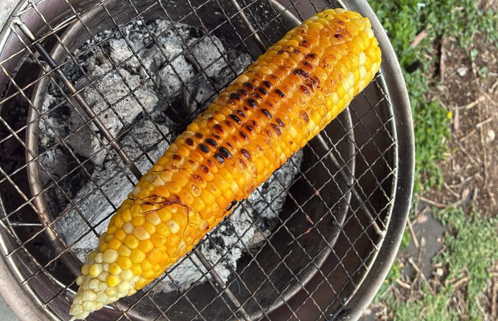 - 焼きの目安としては弱火でじっくり30分、皮全体が真っ黒になるまで焼くのがポイント。トウモロコシは水分が多い野菜なので皮のなかで蒸し焼きの状態を作ります。