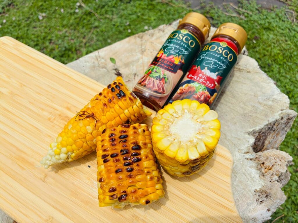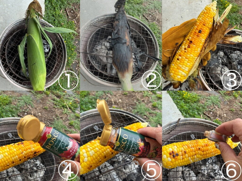 - むいたトウモロコシを網に戻し、BOSCOシーズニングオイル ローストガーリックをかけながら、トウモロコシを回転させ全体を焼いていく。