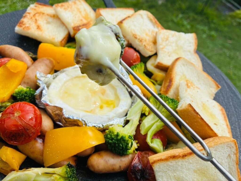 家族みんなで囲んで楽しめるチーズフォンデュはキャンプ飯にピッタリです。ワインのあてとしてもおすすめですよ!