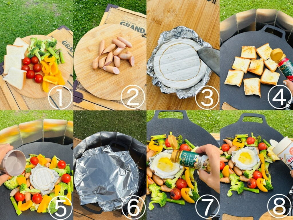 - マルチグリドルの真ん中にカマンベールチーズ、その周りにカットした具材を全ていれ、少量の水を回しかける。