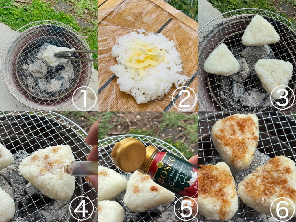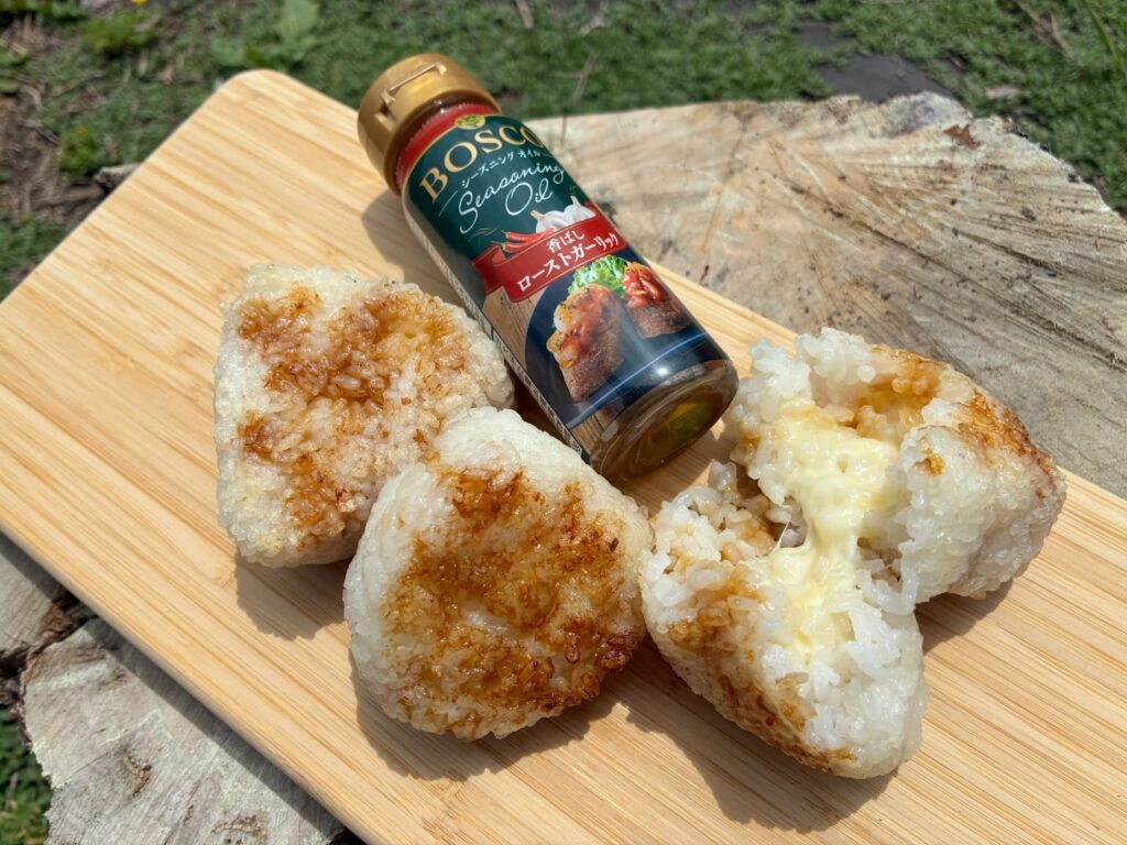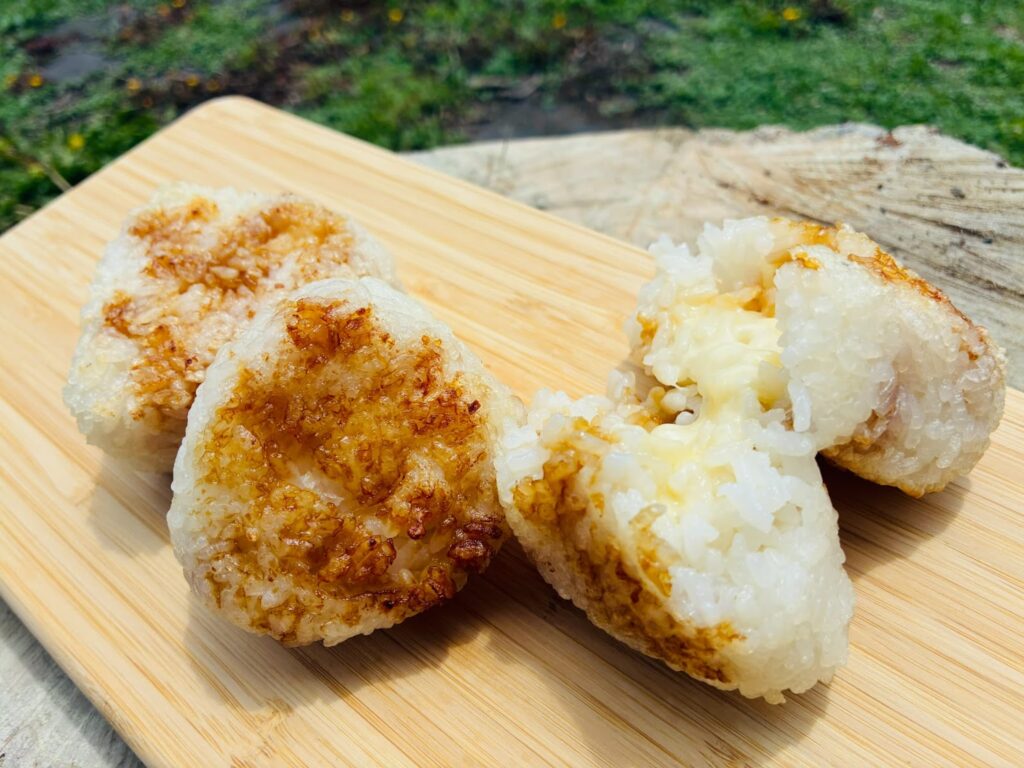 とろけるチーズが嬉しい香ばしいガーリックの香りが食欲をそそる、キャンプの定番焼きおにぎり!