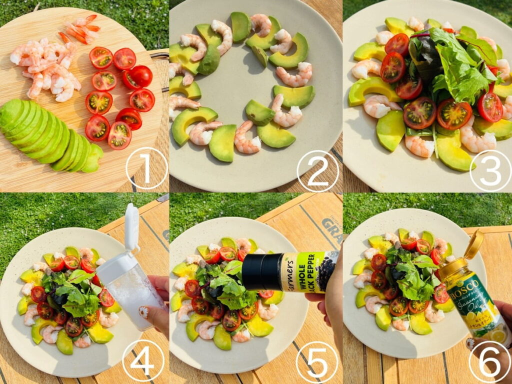 - ミニトマトはヘタを取り半分に、エビは尾を取っておく。アボカドは½にしたものをスライスしておく
