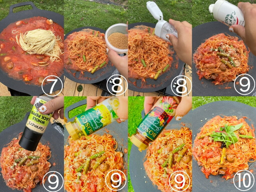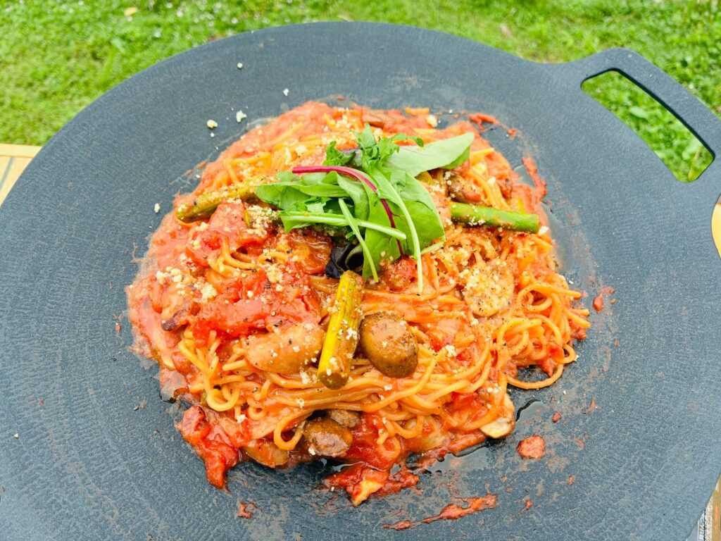水漬けしておくことで、茹でる過程を省き時短で作れるパスタはキャンプの強い味方!