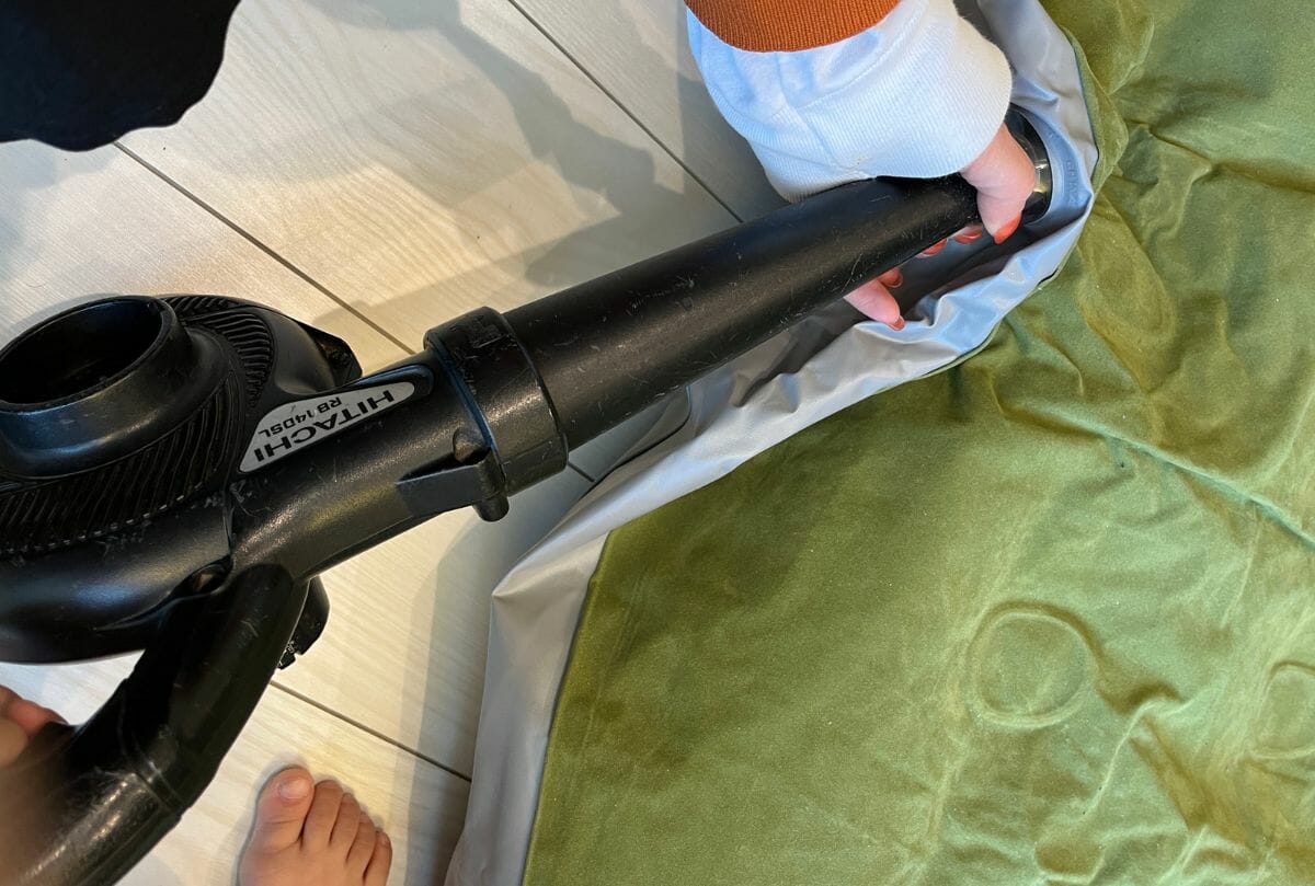 収納用の袋に空気を入れ、空気口にセットして手で膨らんだところを押して入れます。なれるまでは少しコツが必要ですが、極力コンパクトにしたい人向け。
