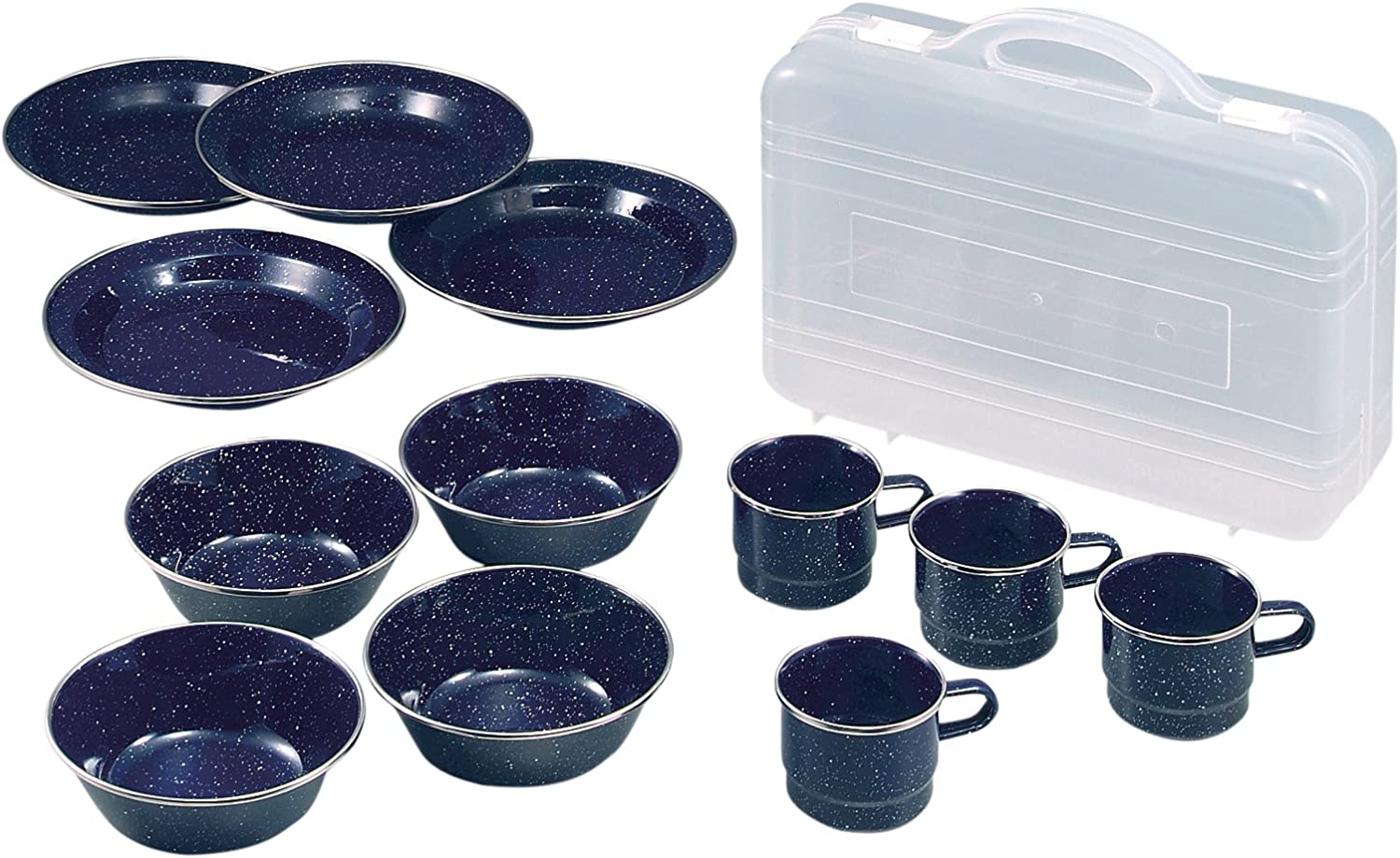 4人分のプレート、ボウル、マグカップがセットになったホーローのカトラリーセット。