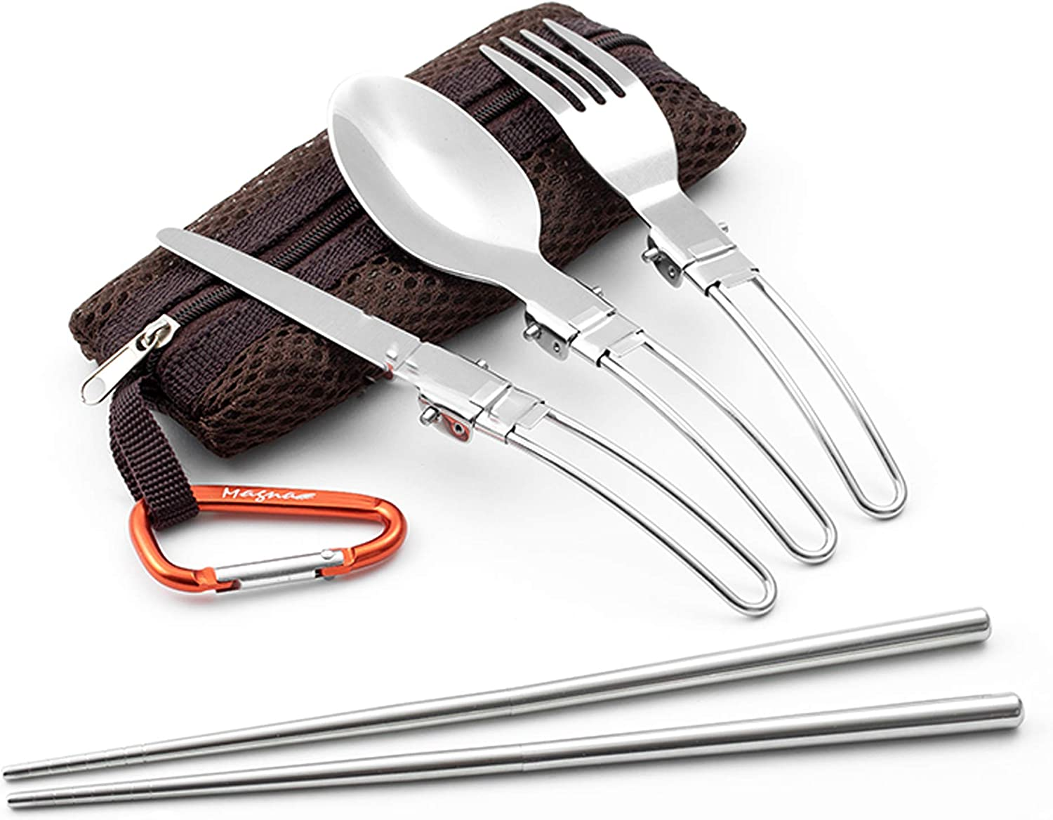 ■MAGNA(マグナ) 折畳式 シングル カトラリー メッシュタイプ 収納袋 フォーク スプーン ナイフ つなぎ箸 カラビナ 6点セット