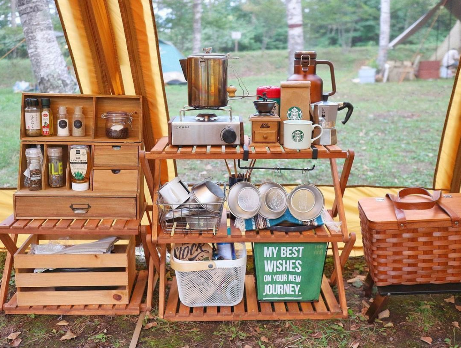 キャンプのキッチンは、その時の気分に合わせてレイアウトやデザインを変えられるのが魅力。