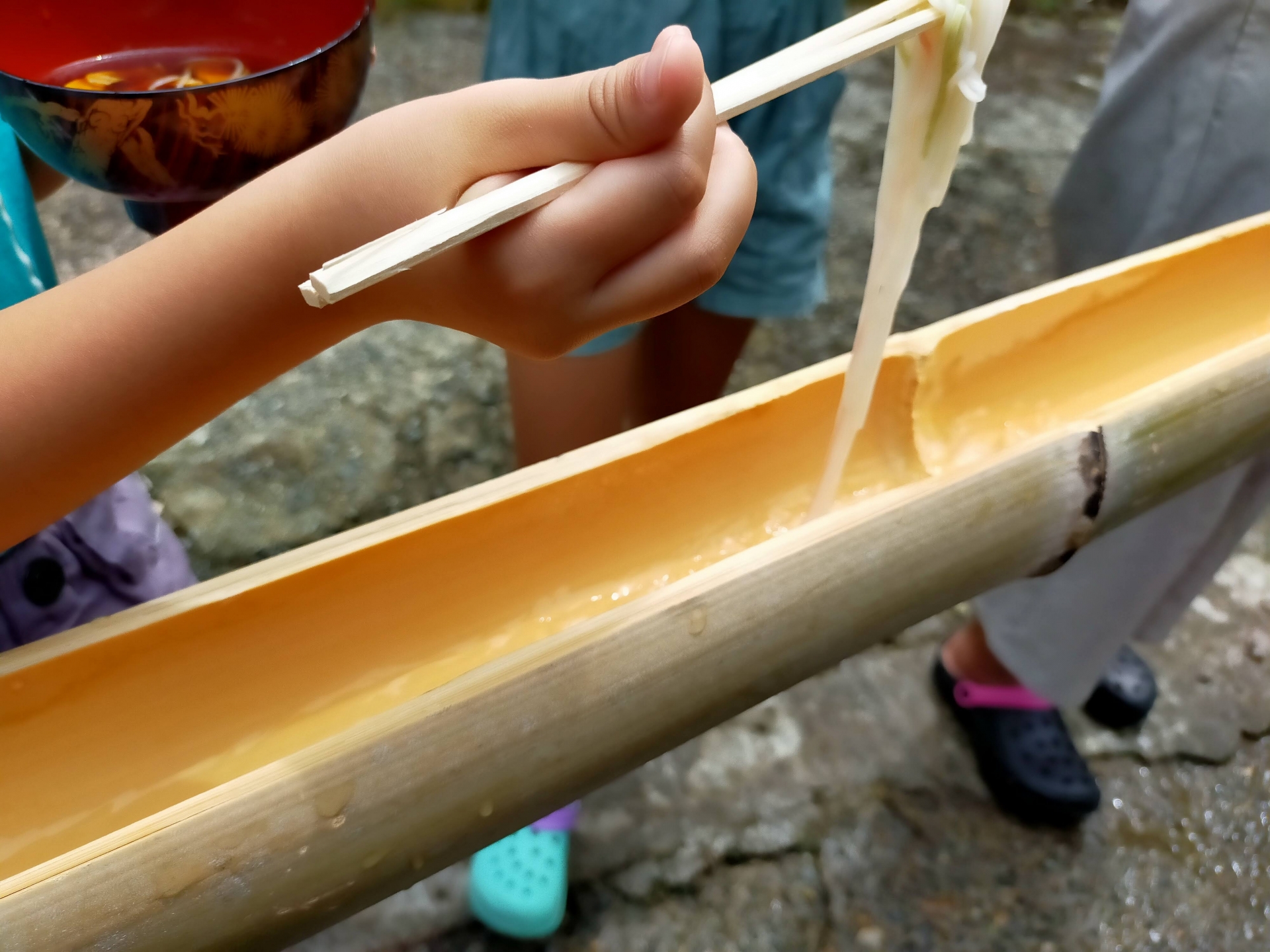 キャンプでは床が濡れることを気にせず、外で本格的な流しそうめんが楽しめます。