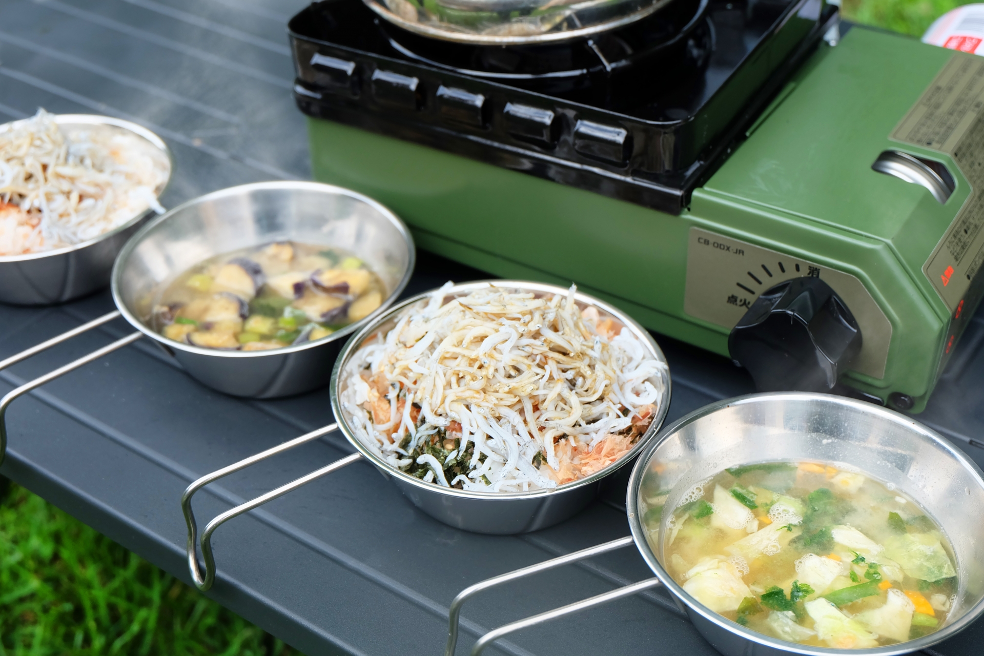 炊き立てご飯に、みそ汁だけでも大満足。キャンプの朝は冷え込むことが多いので温かい汁物が必須です。