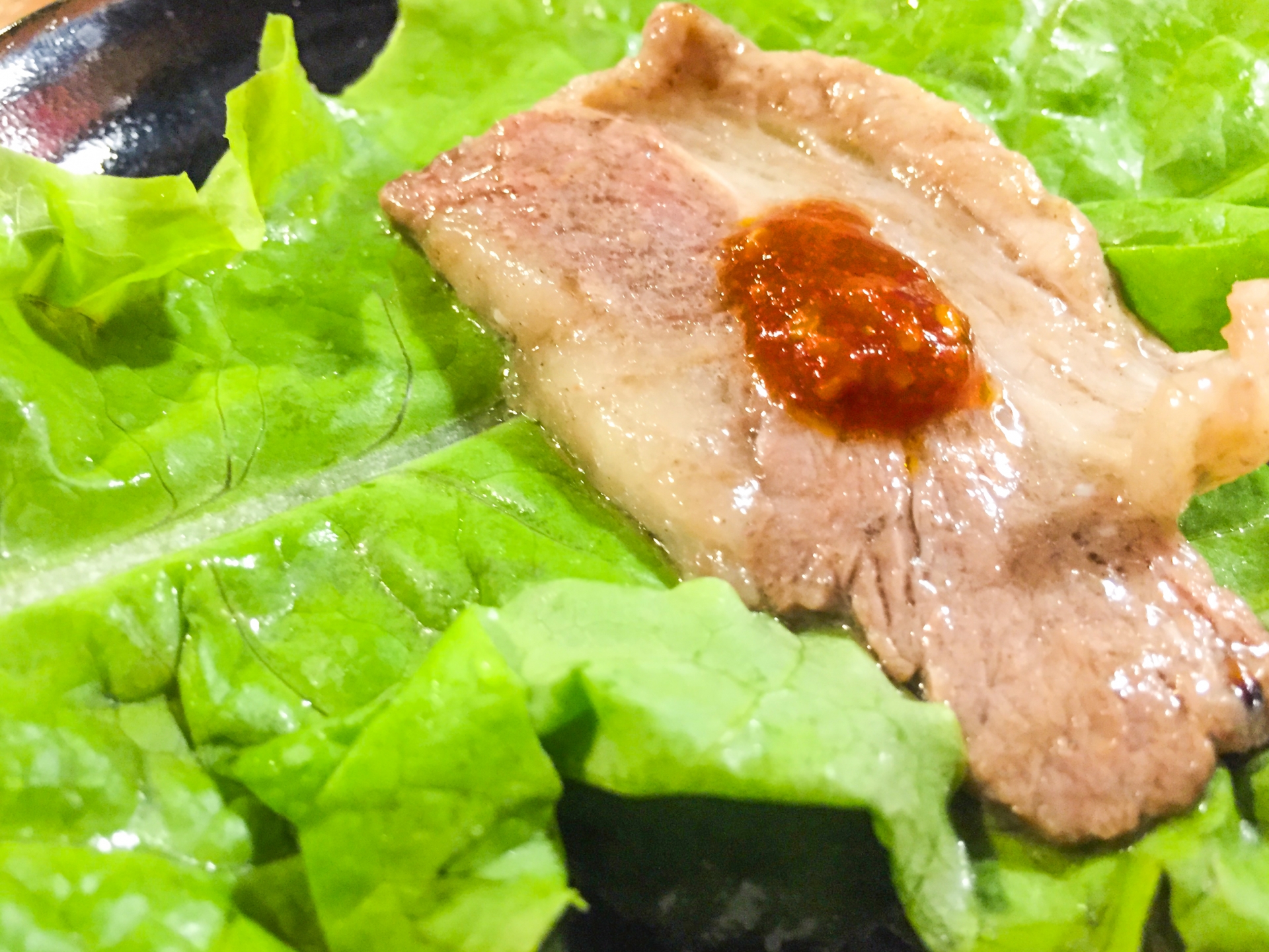 生野菜に、焼いたお肉とお好みの味付け味噌を巻いて食べるだけ!