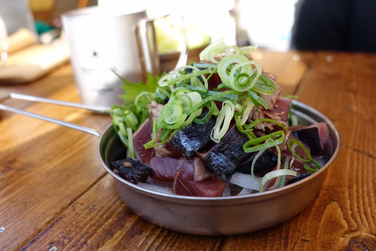 春秋におすすめ!鰹の表面を炭火で焼き、ポン酢や薬味入りのポン酢でいただく贅沢でキャンプならではの一品です。