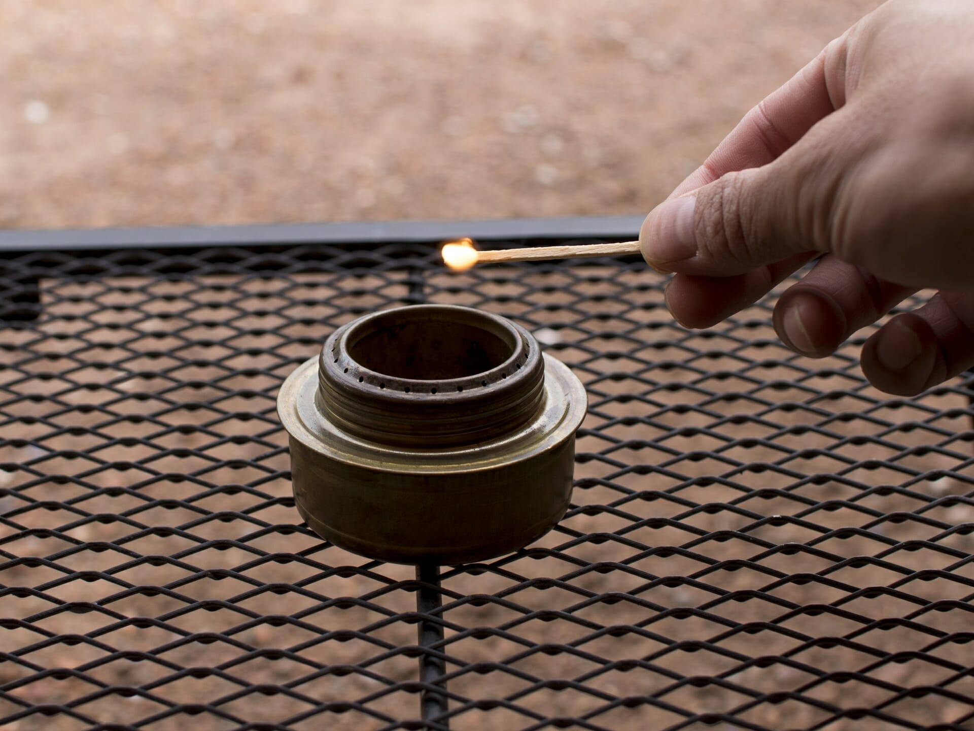 その後マッチやライターを使って燃焼に近づけて点火をし、アルコールが気化して本燃焼に入るまで待ちましょう。