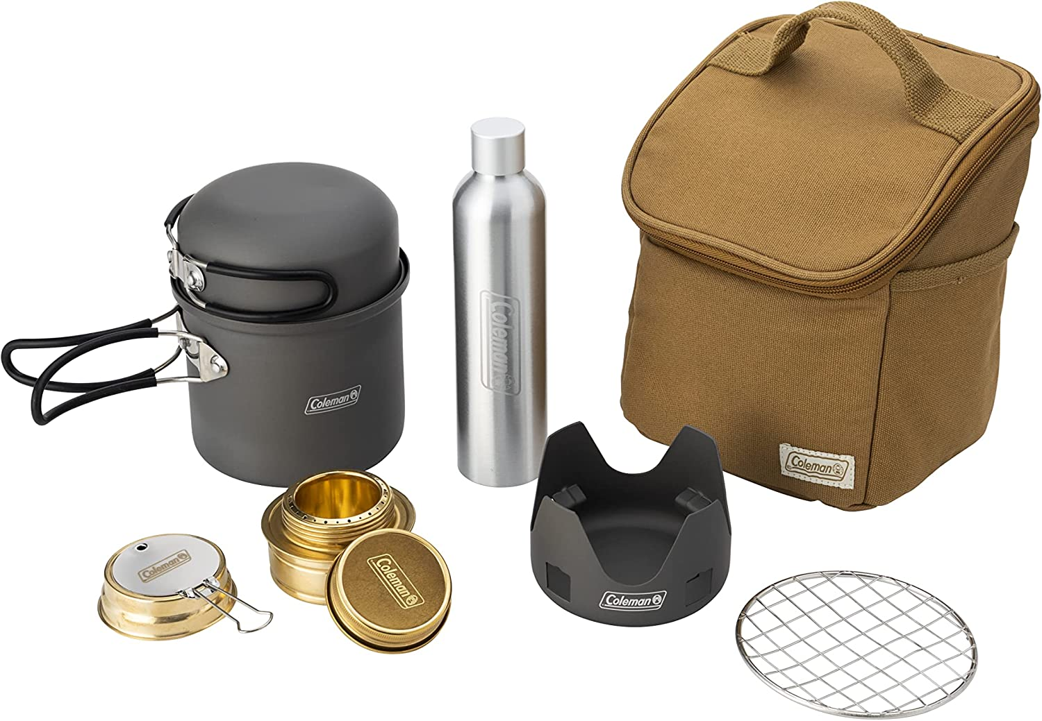アルコールストーブデビューに、コールマンのアルコールバーナー、五徳、クッカー、燃料ボトル、キャリーケースが一つになったセットがオススメです。