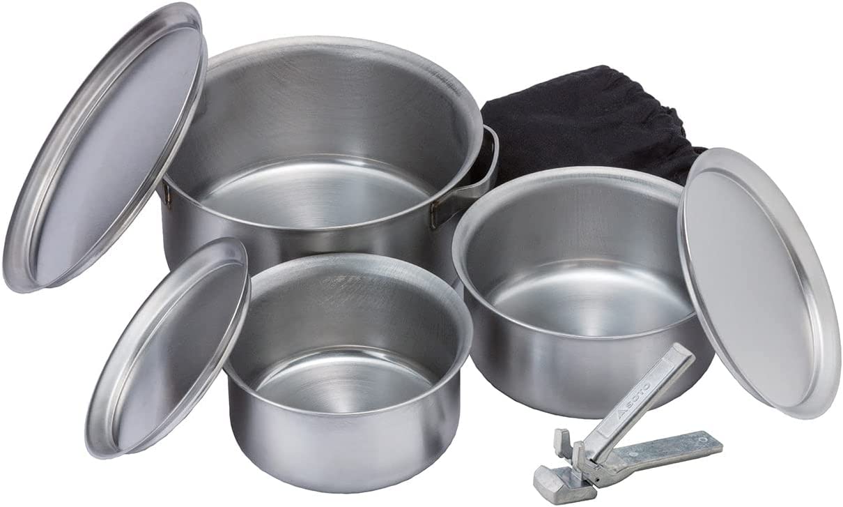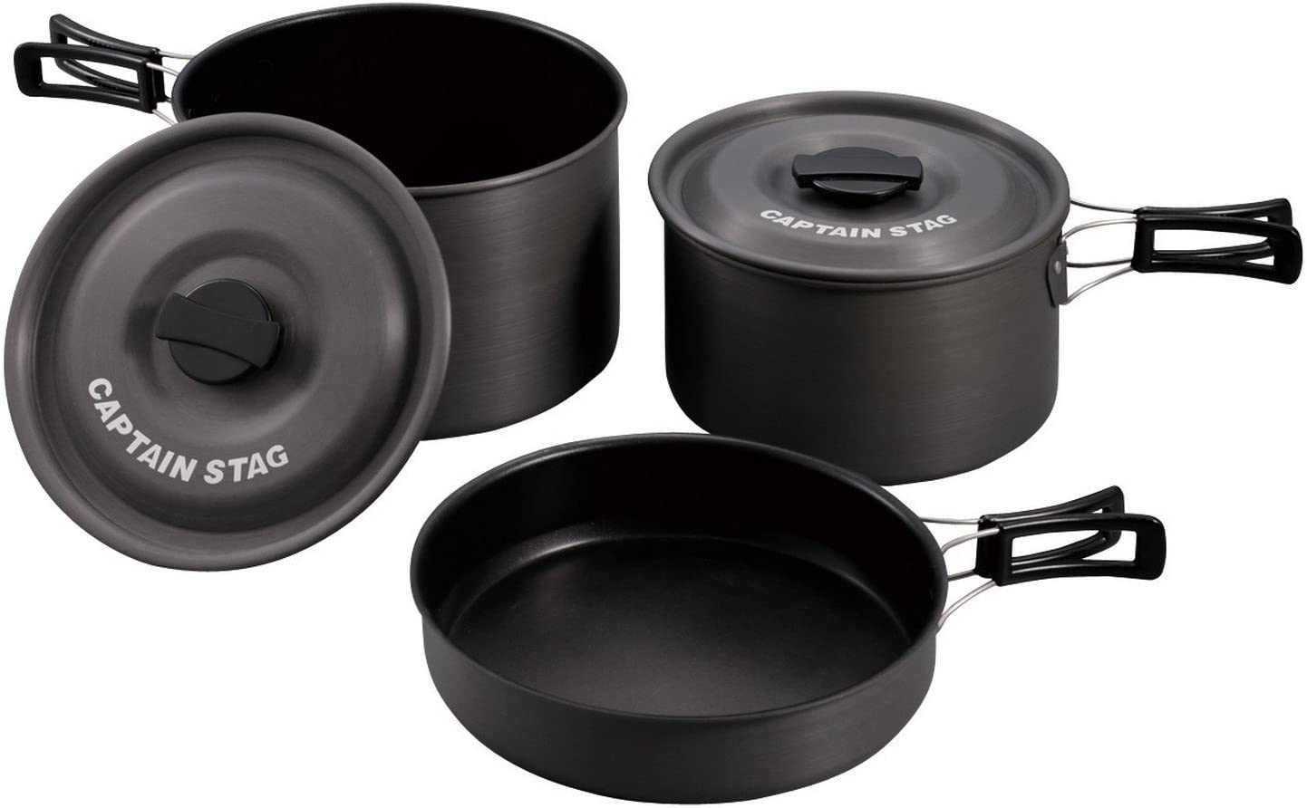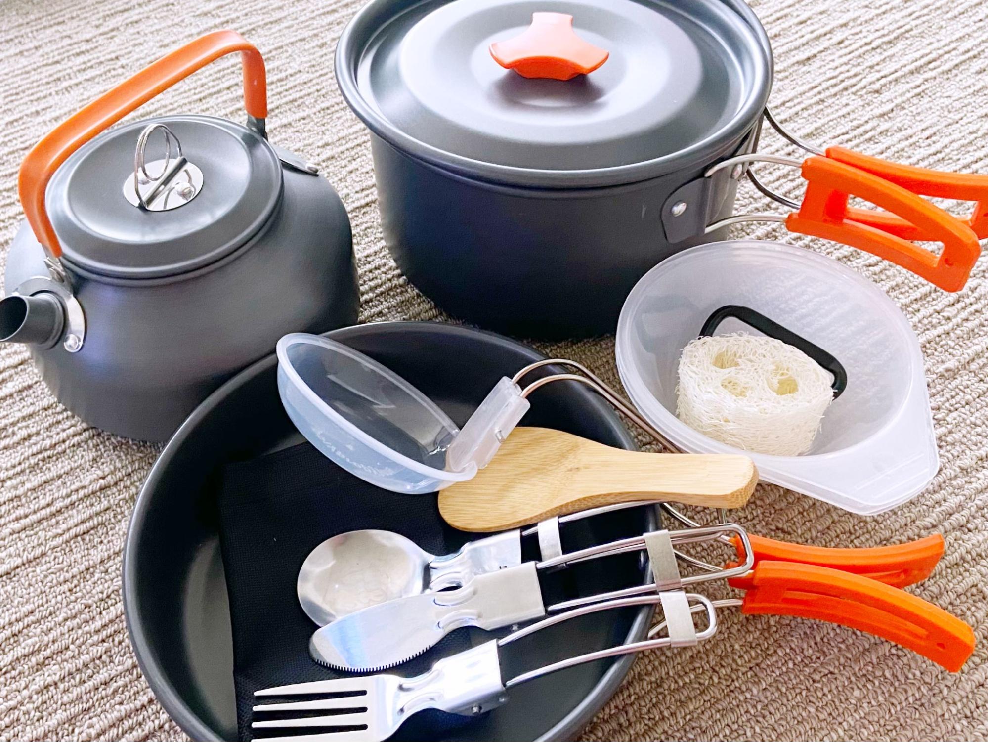 3種類の深さのクッカーと食器がセットになったソロキャンプ〜カップルでのキャンプにおすすめのアルミ製のクッカーセット。