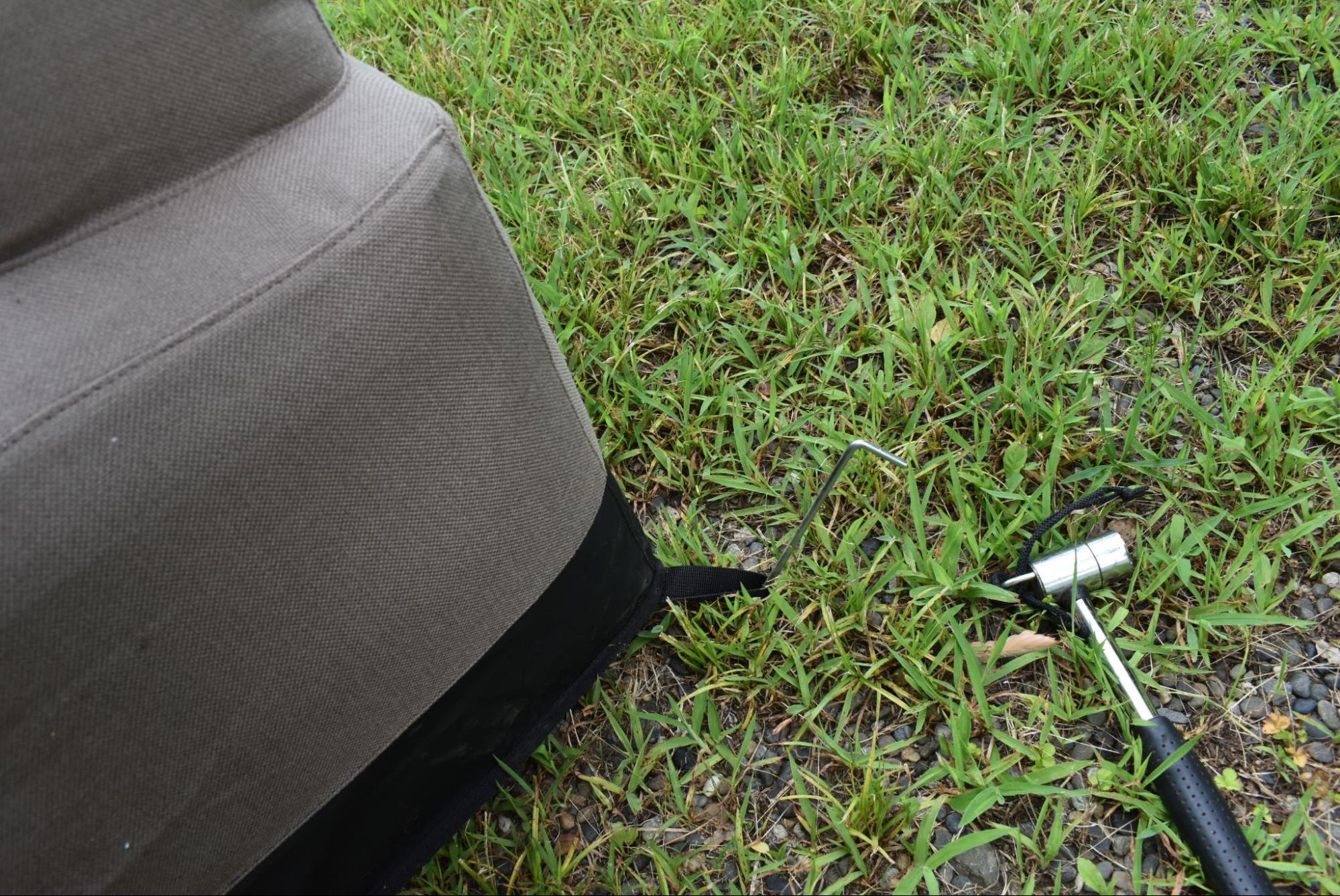 エアカウチには固定用のペグループがあり、ペグダウンすれば多少の風ではびくともしません。