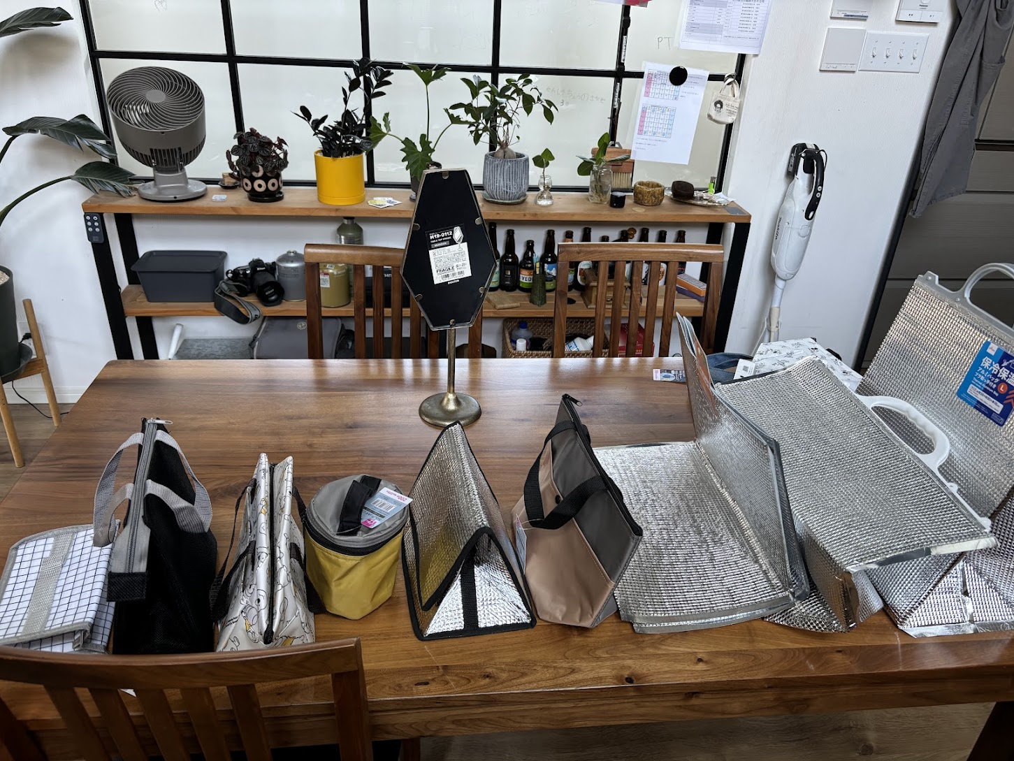 各保温保冷バッグに、ひとつずつ保冷剤を入れ、ダイニングテーブルの上に放置しました。