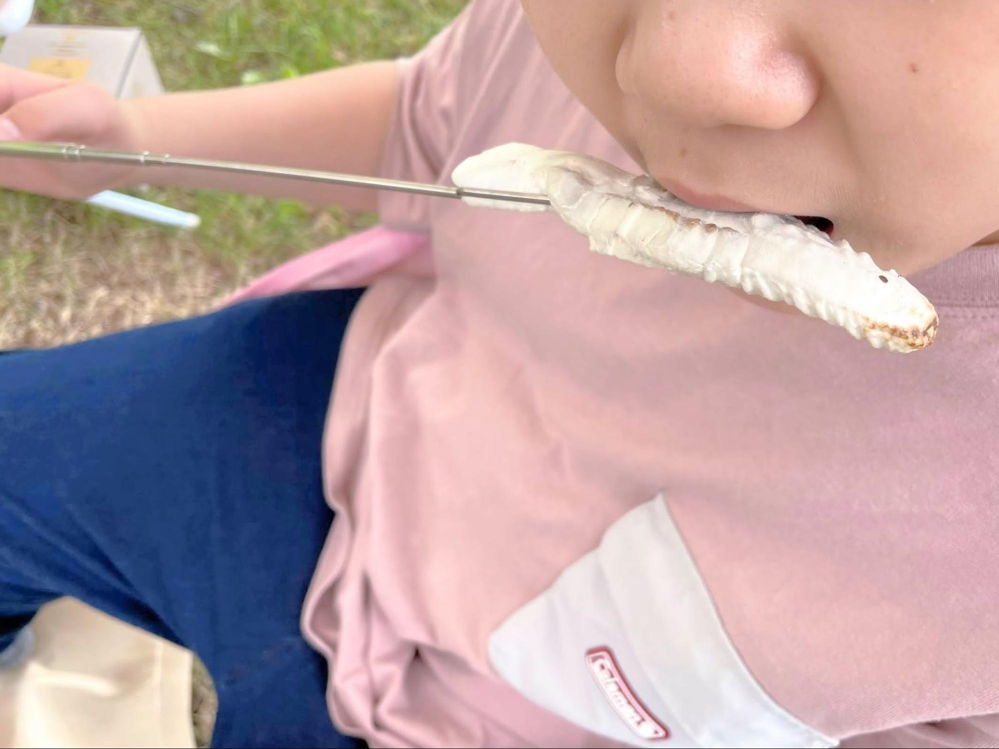 まかせて!お魚そっくりで、まるで鮎の塩焼きのような見た目で可愛い「フィシュマロ」っていうマシュマロがおすすめ!今回はベテランキャンパーマミさんに、実際にキャンプでフィシュマロを焼いてもらったよ!