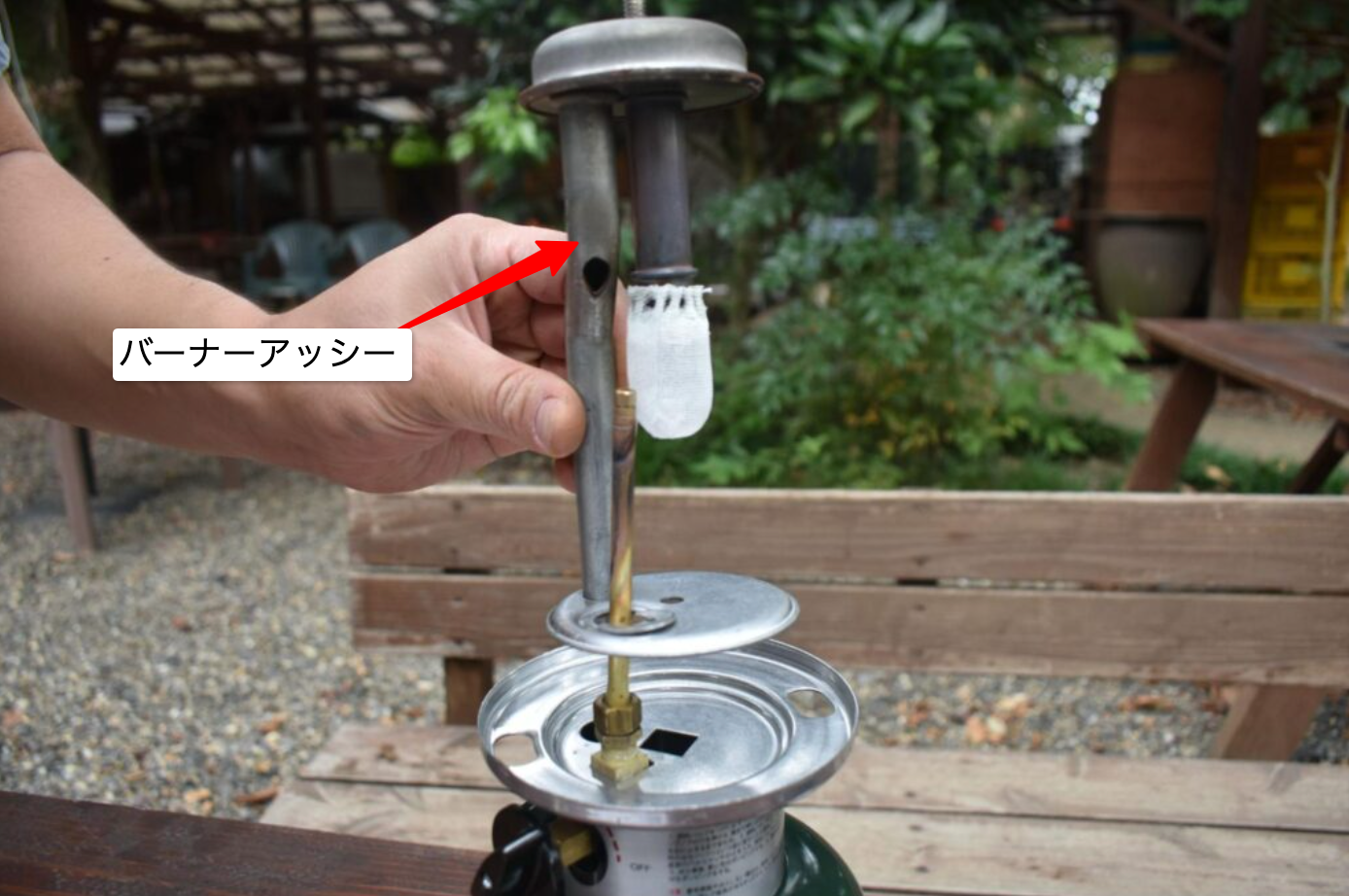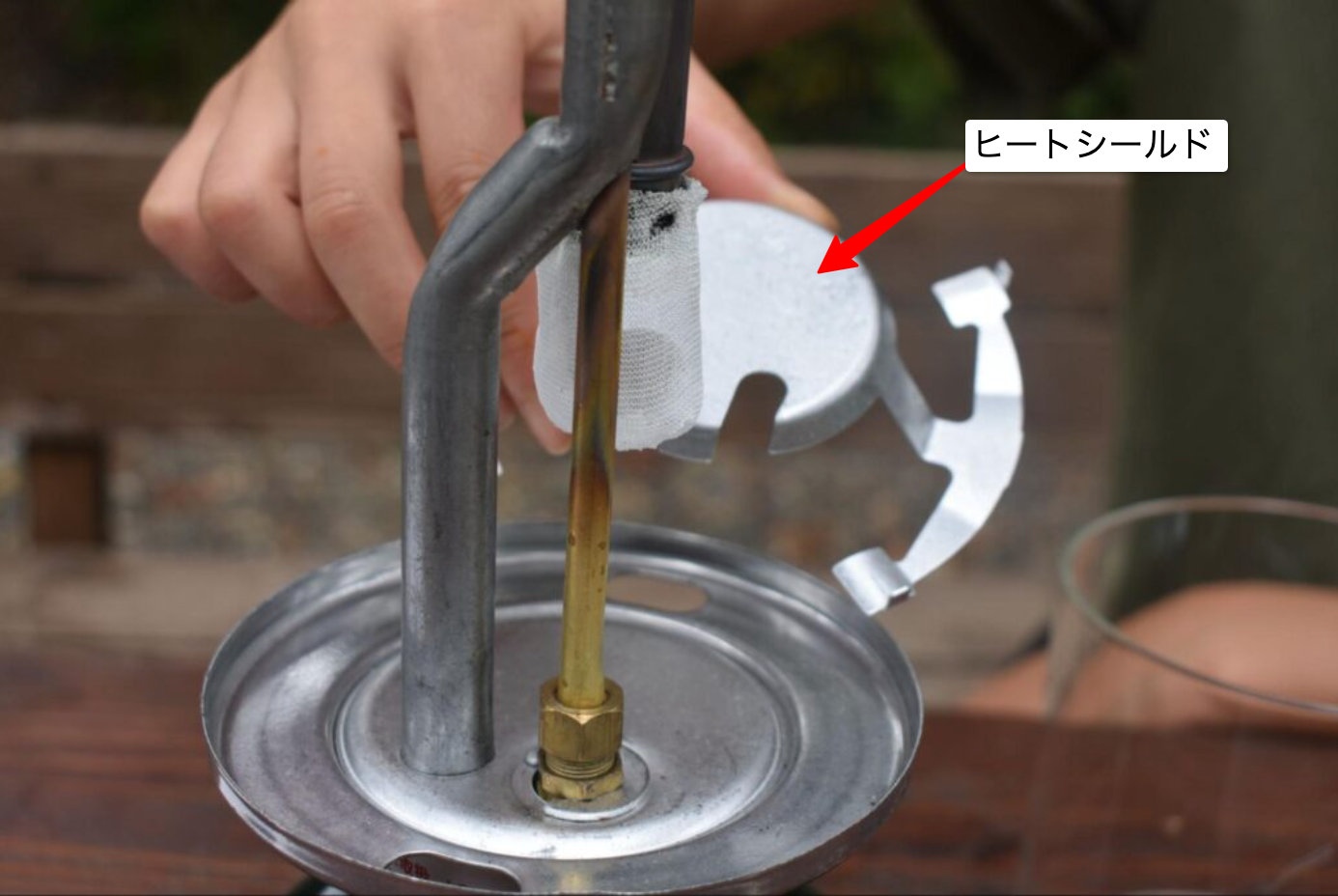 ランタン上部先端のボールナットを外し、ベンチレーター(傘の部分)やガラスのホヤを外したら、シルバーのヒートシールドを取り外します。