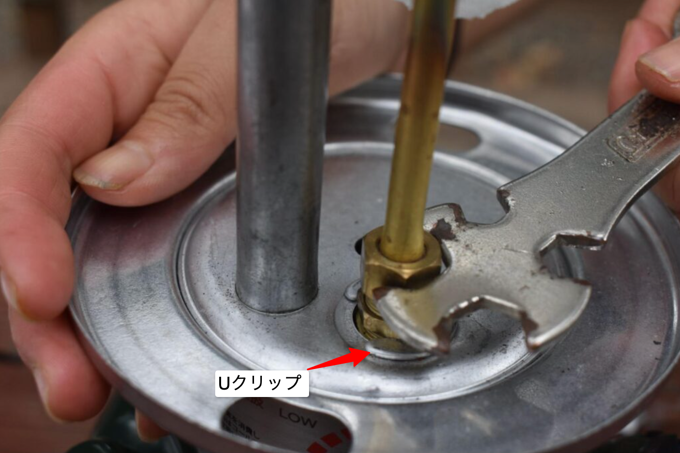 スーパーレンチを使ってフレームナットの下にあるUクリップを取り外します。