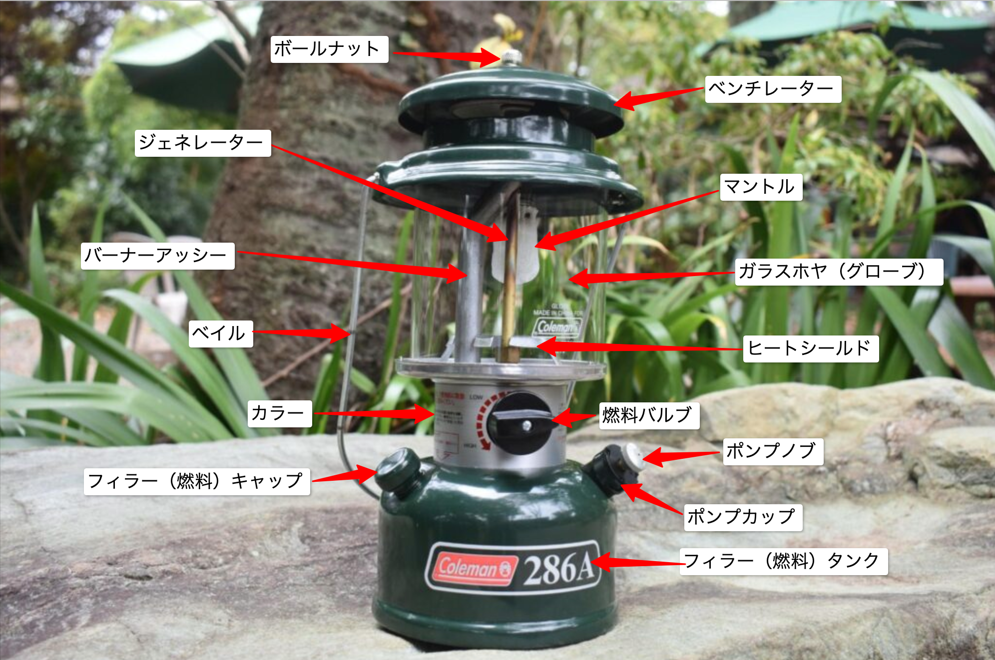 専門用語が出てくるので、ランタンの各パーツの名称をまず確認しておきましょう。