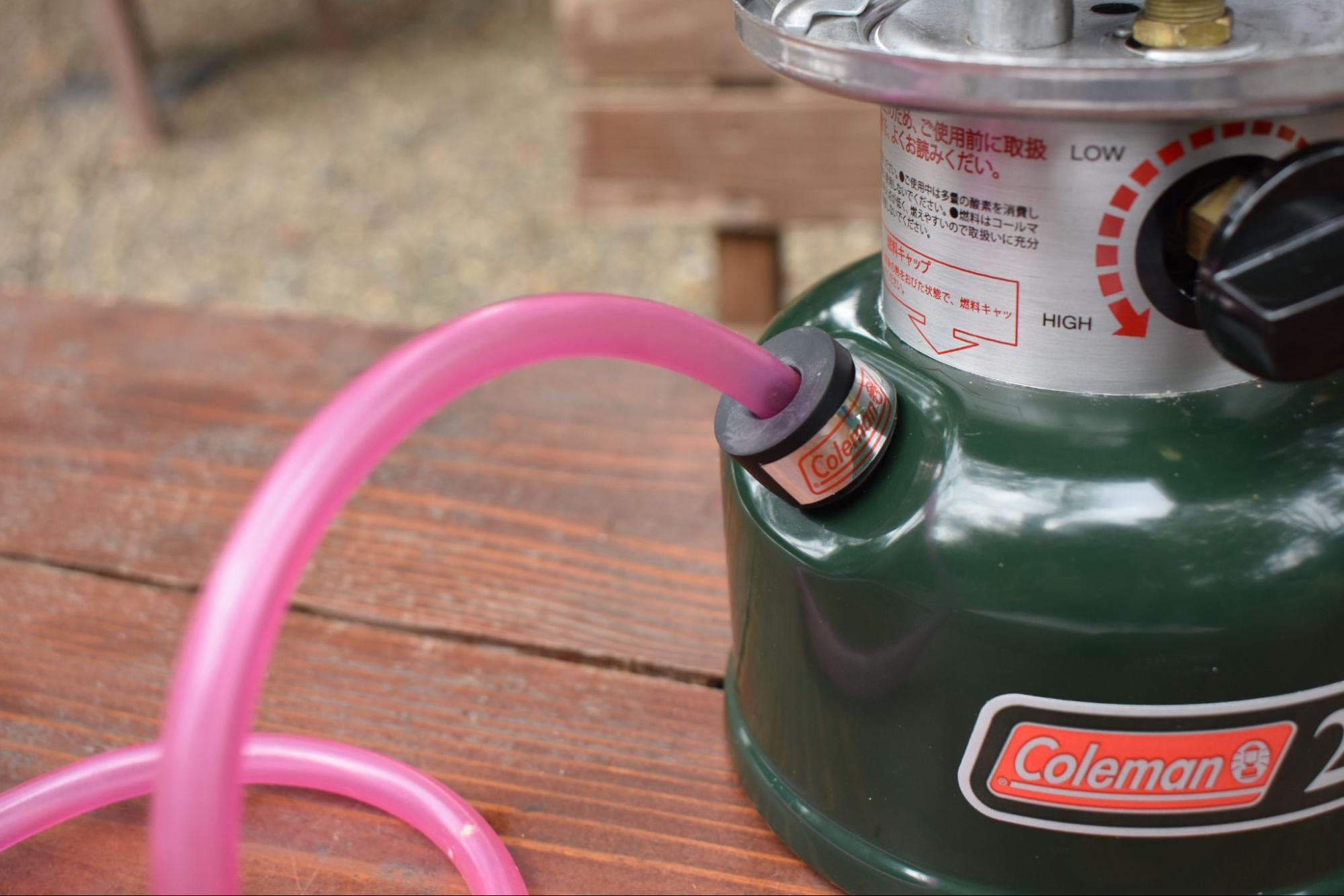 使い方は簡単。金属の金具がついた方をタンクに差し込み、黒いゴムキャップを燃料キャップの部分に差し込みます。あとはポンピングするだけで残ったホワイトガソリンがするすると汲み上げられてきますので、空のガソリン容器などに移していきます。