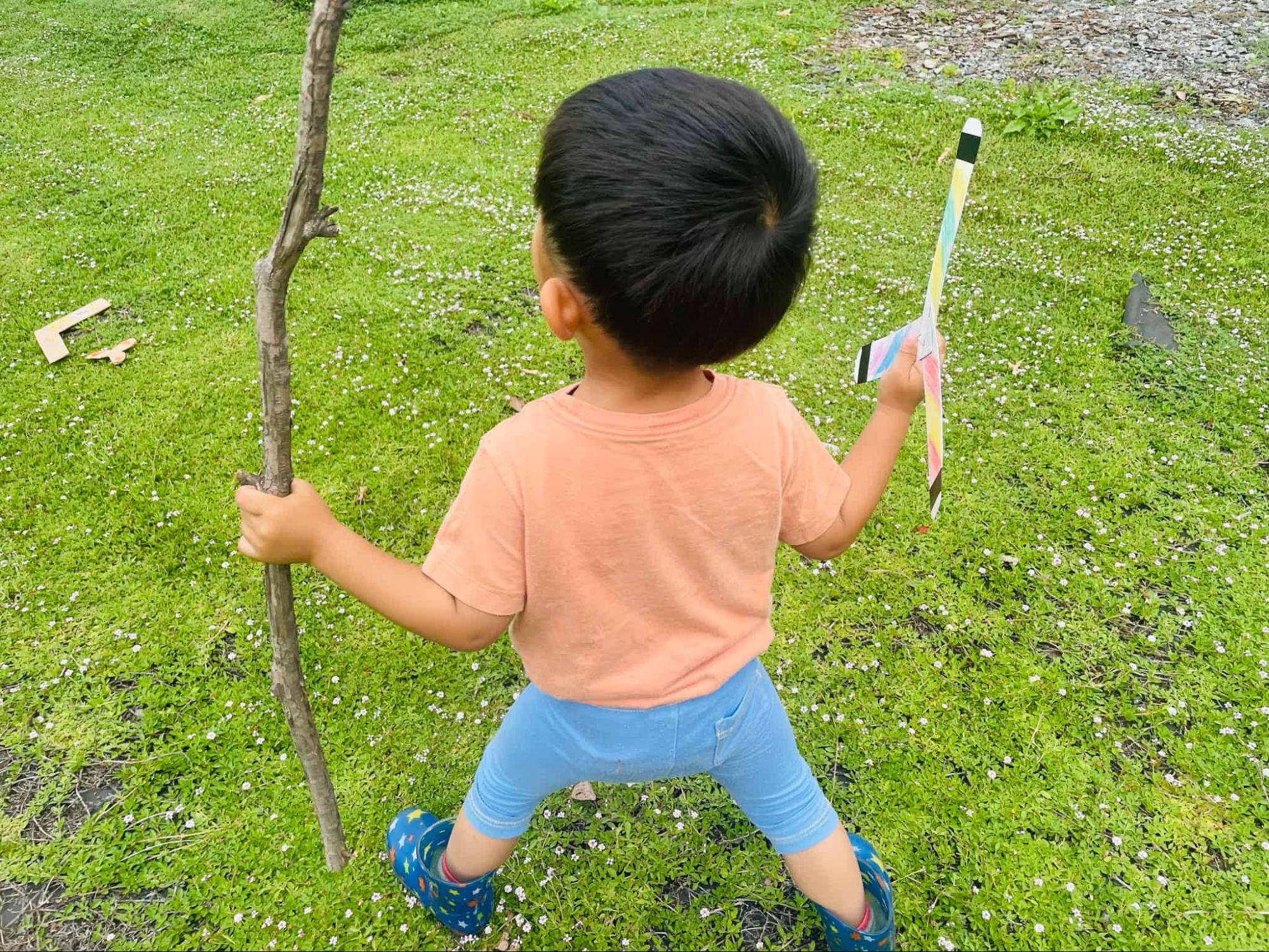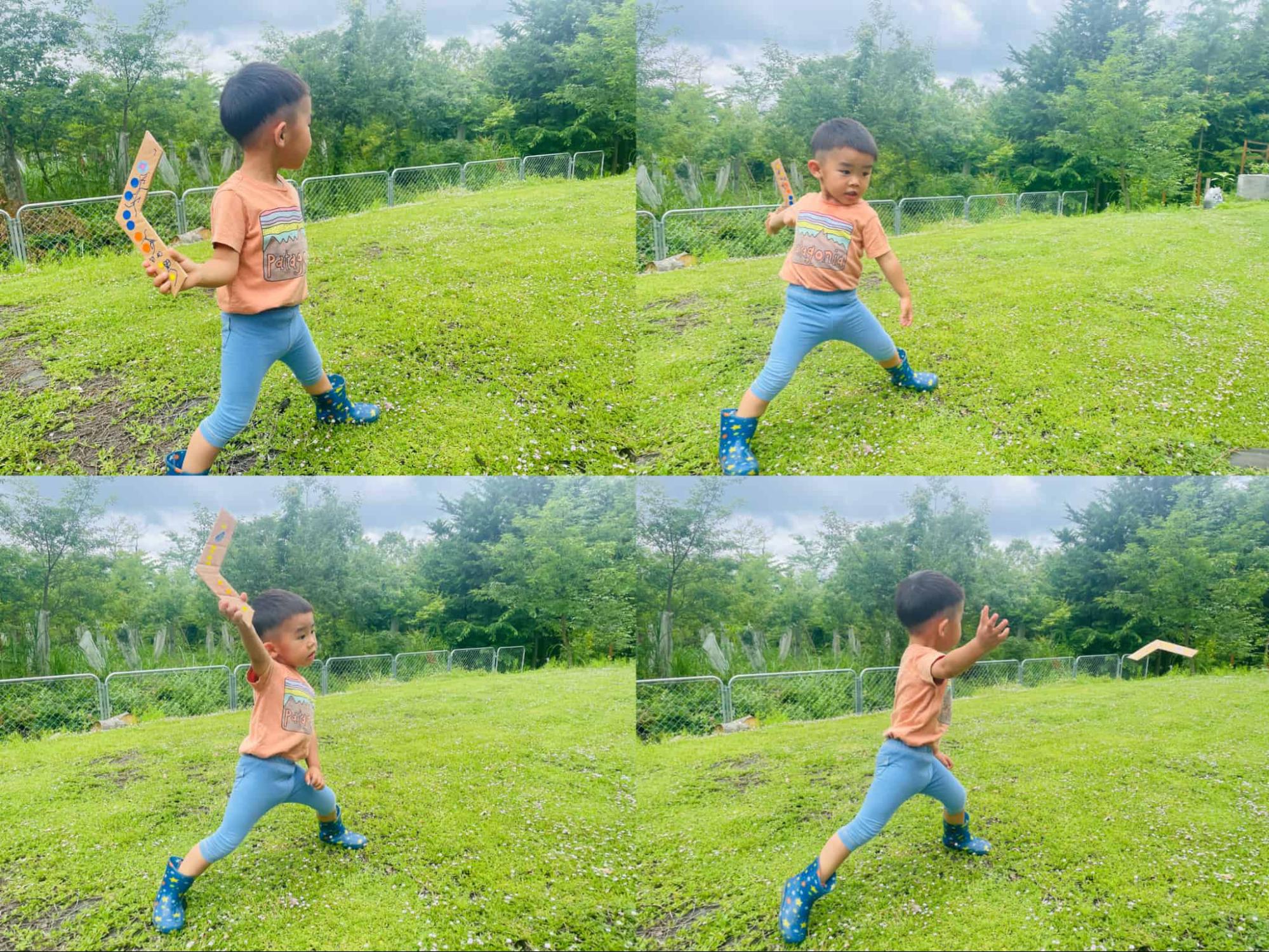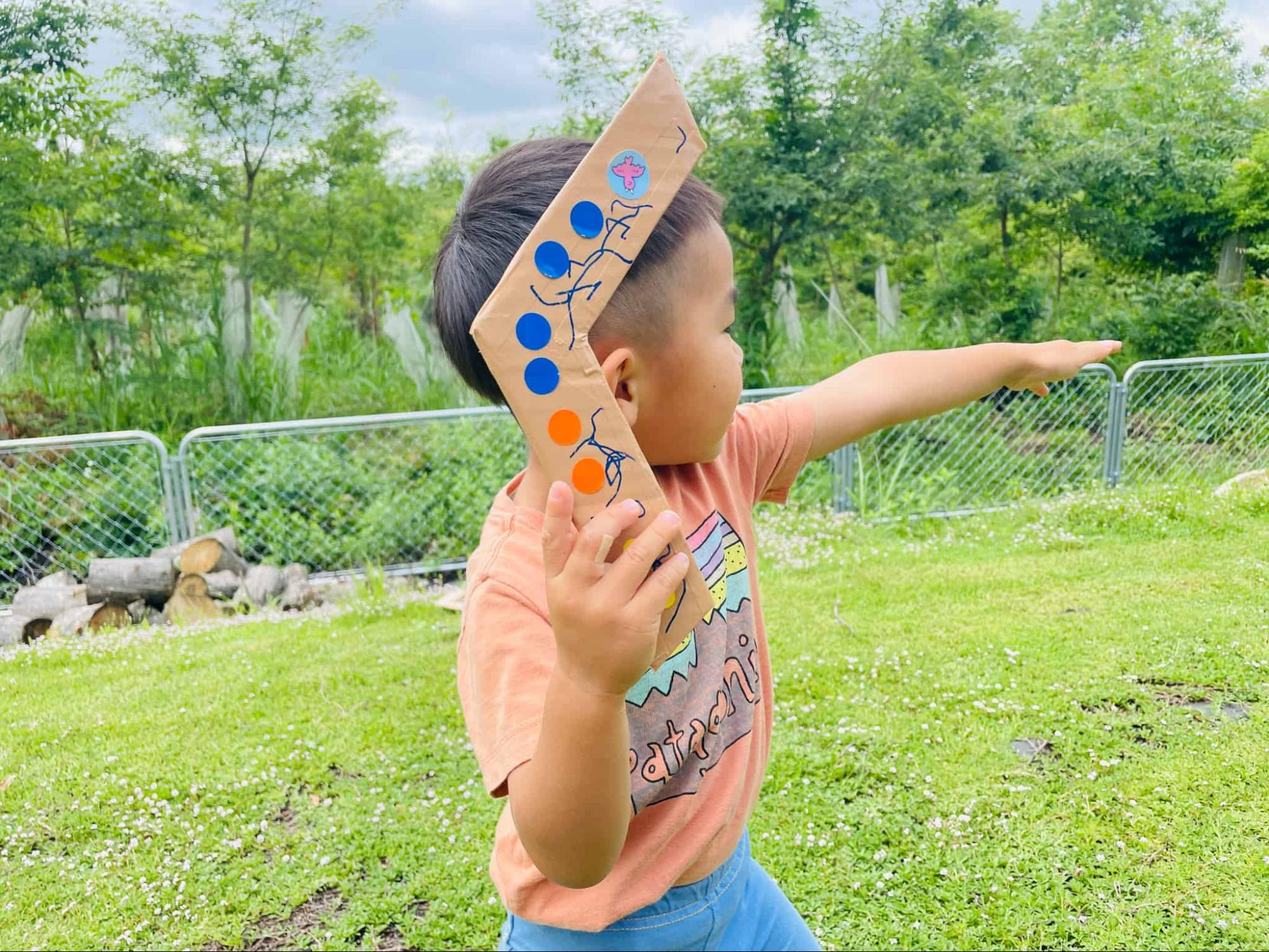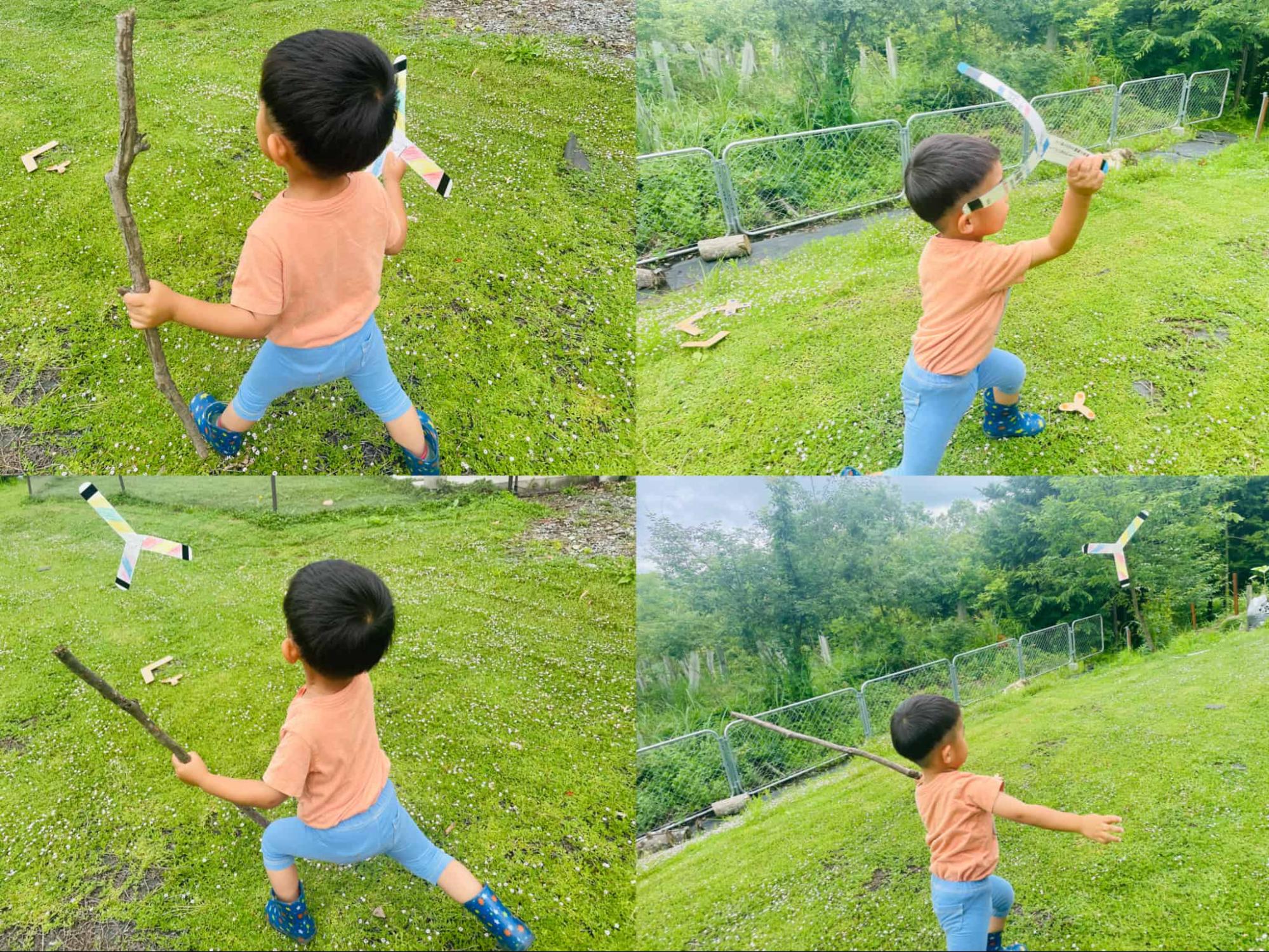重さが飛距離に比例することがわかったので、途中ガムテープを巻き足しながら、誰が一番遠くに飛ばせるか競い合ったり、キャッチボールのように投げたブーメランを追いかけたり遊び方はさまざまです。