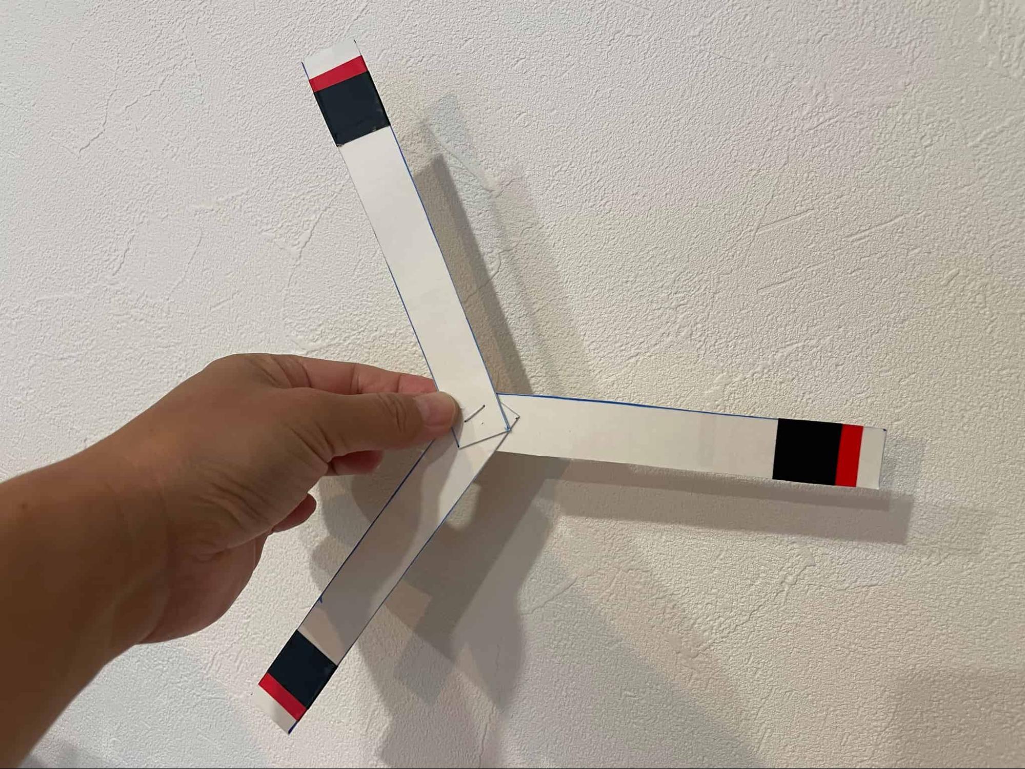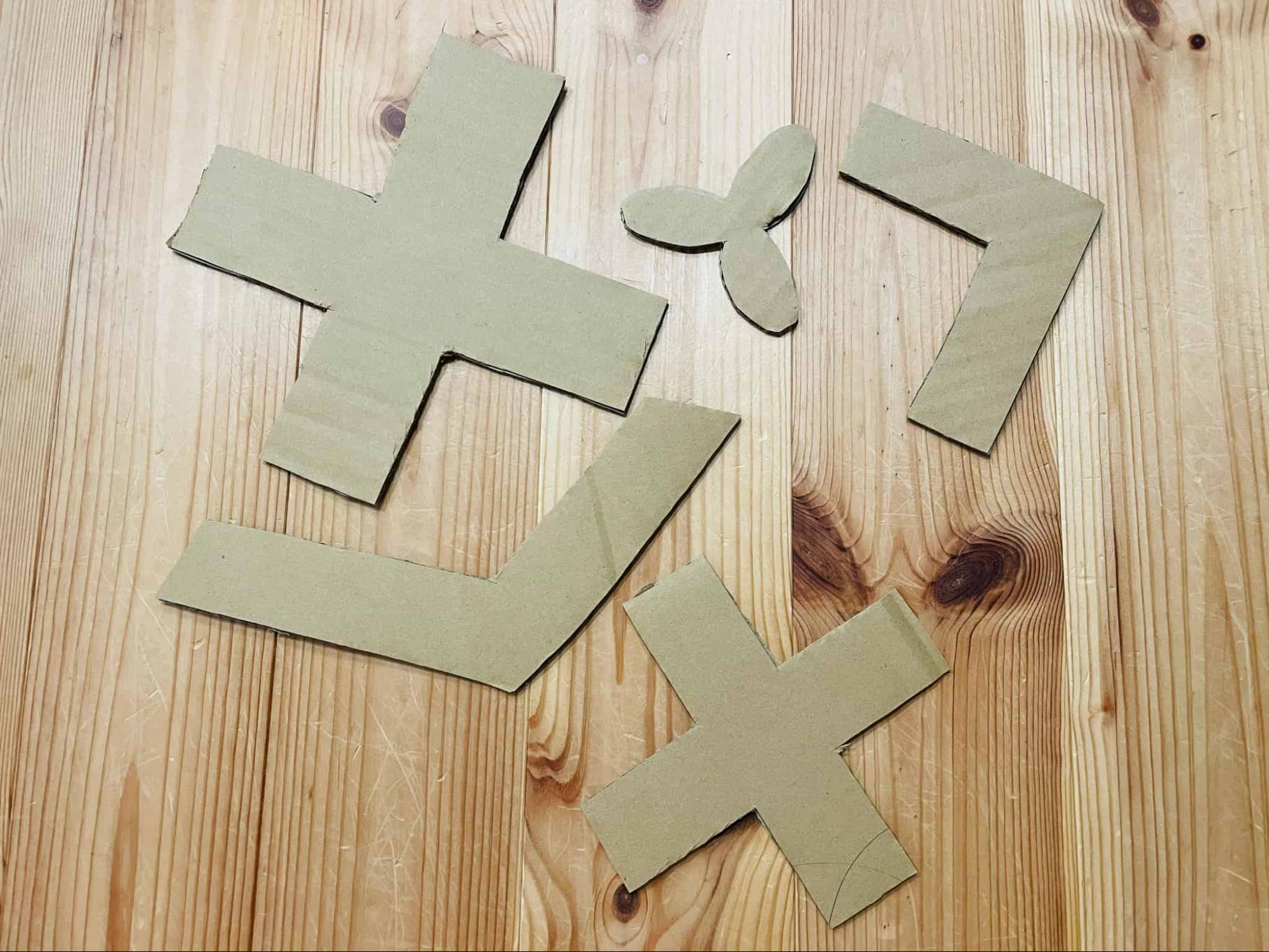 段ボールをよく見るブーメランの形(+型、V字、シュリケン型など)に切りとります。
