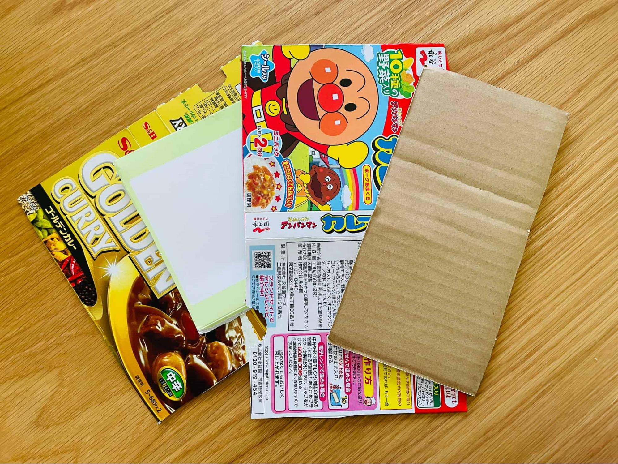 売っている厚紙やお菓子の空箱など、ある程度の厚さのある紙なら何でもOK。