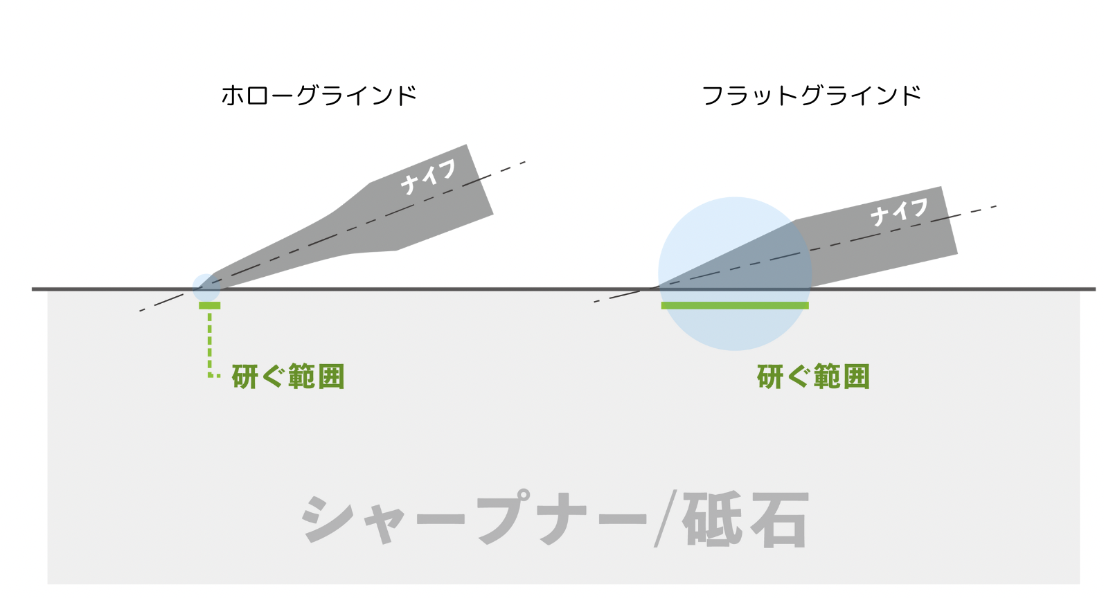 ナイフには種類があり、研ぐ範囲や、砥石の硬さ、研ぎ方が違います。