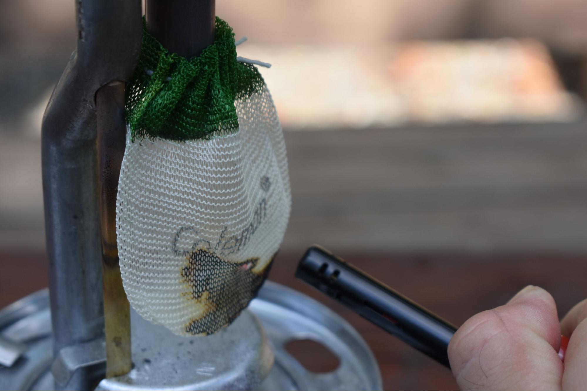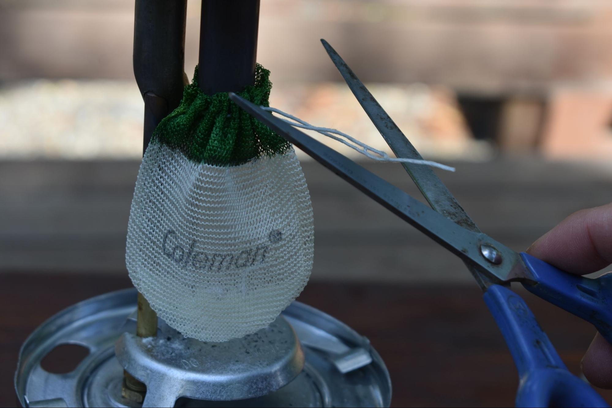 取り付けたマントルは、点火する前に燃やし灰状にします。これを「カラヤキ」と言います。
