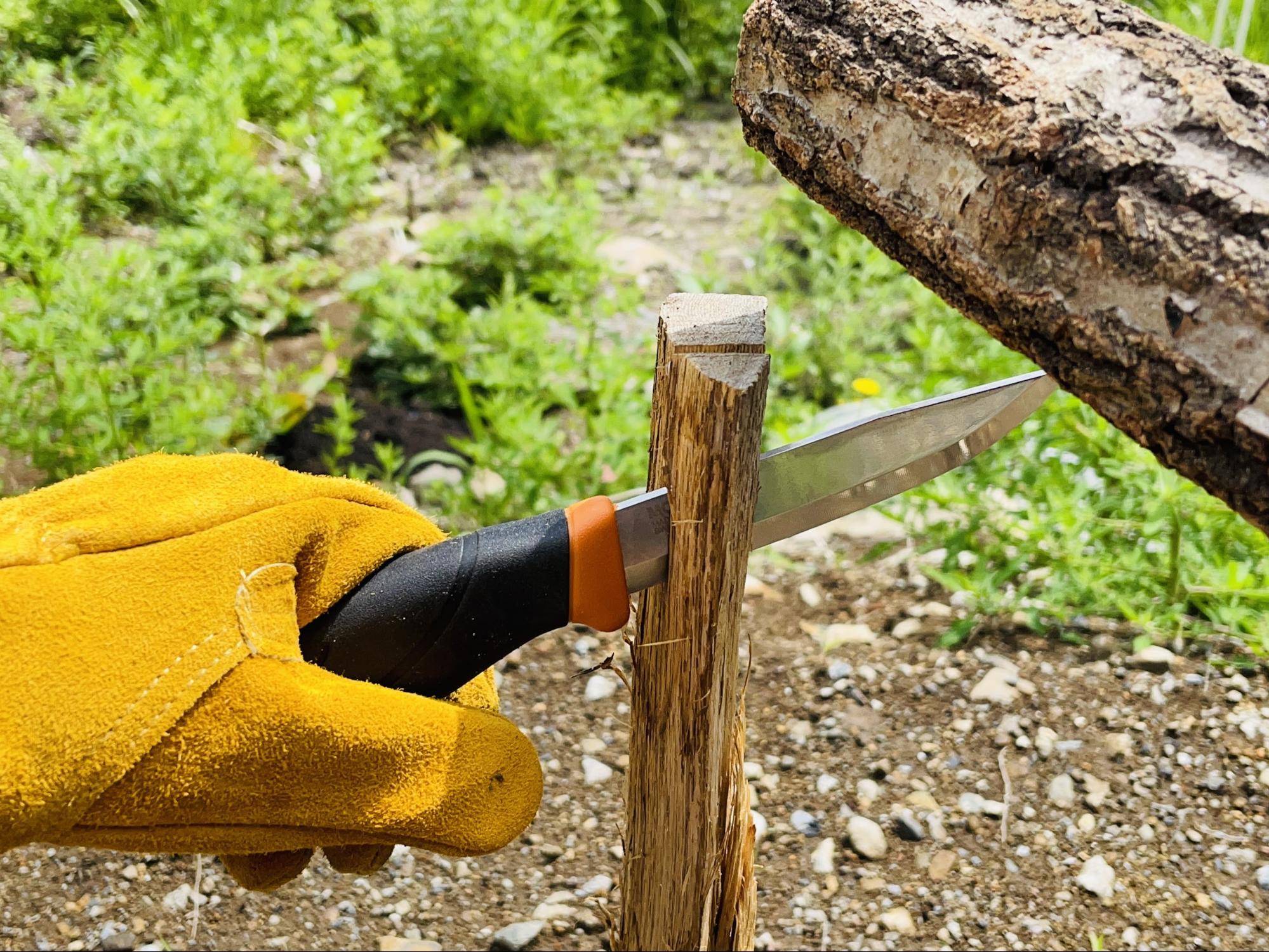 耐刃グローブはナイフの刃先に間違って触れてしまったり、薪のささくれから手を守ってくれるので、怪我防止のためにも使用をおすすめします。