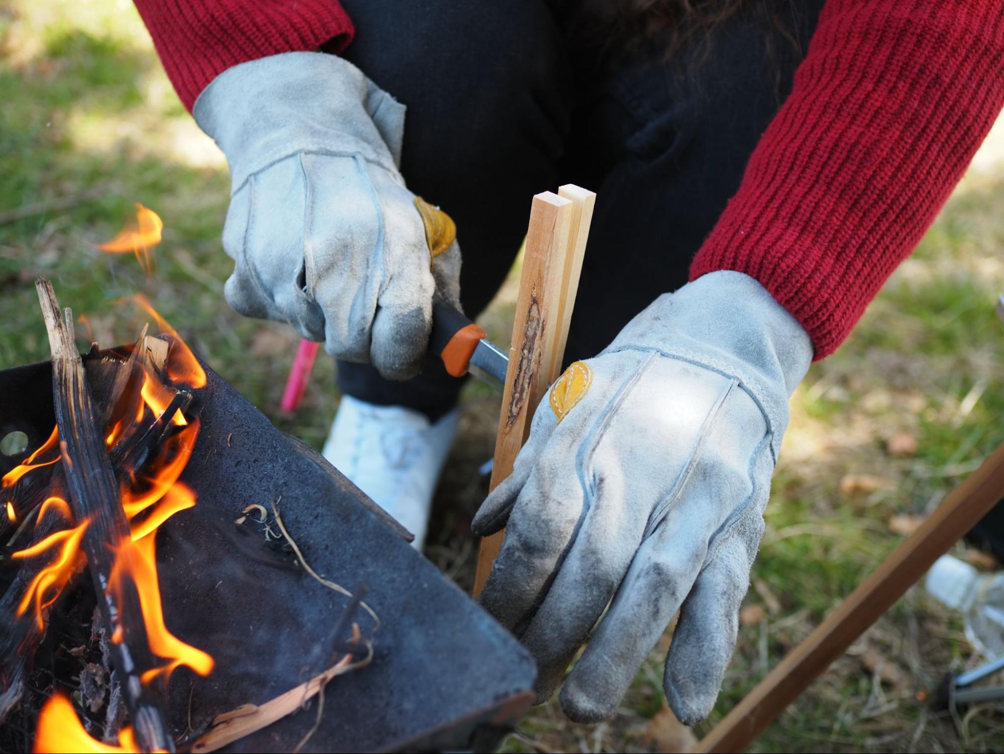 バトニングや薪割りでの使用に加え、焚き火で薪をくべる際や、調理でのスキレットを持ったりするときにも使えます。(熱いものを長い間もつのはお勧めしません)