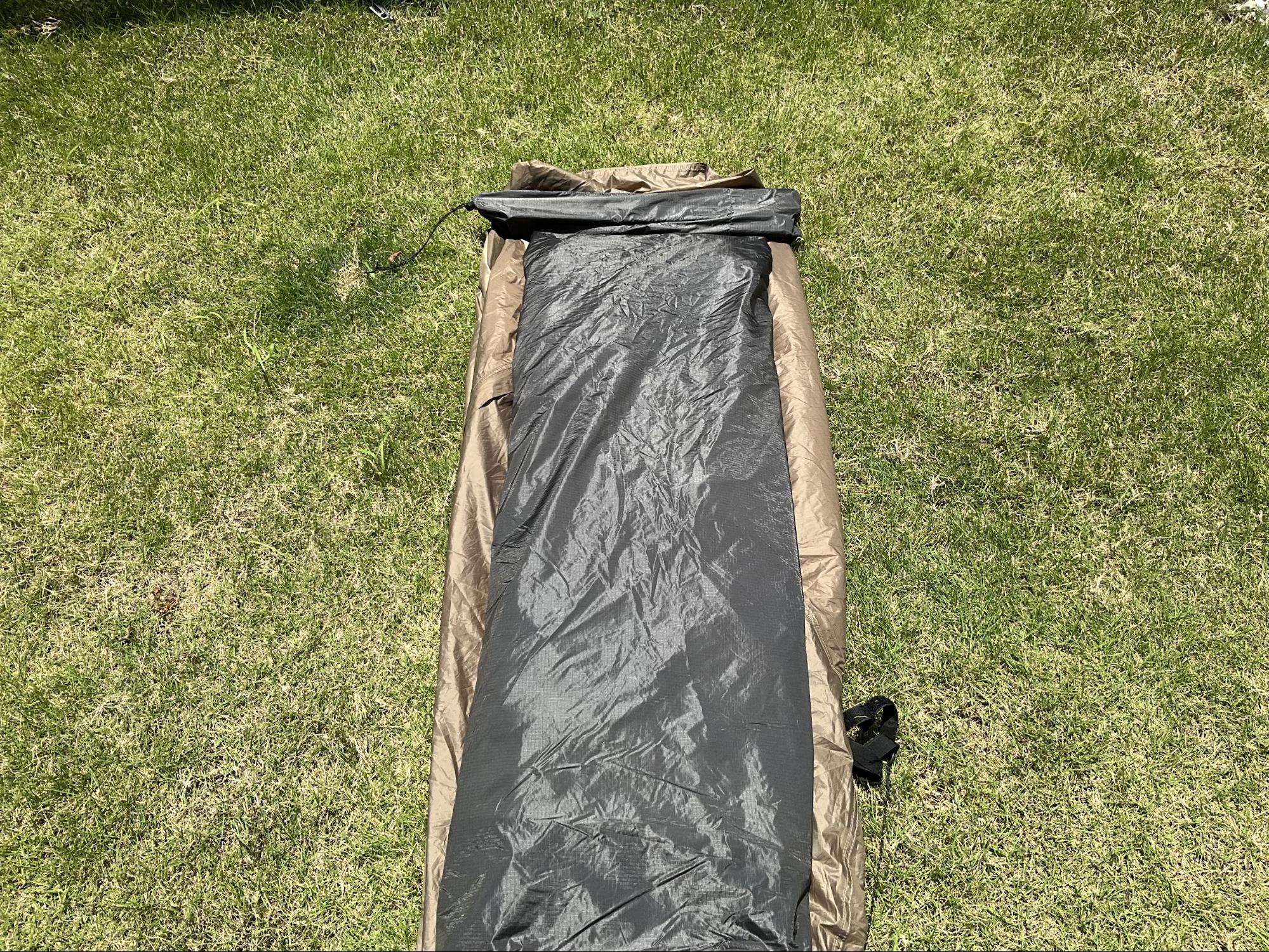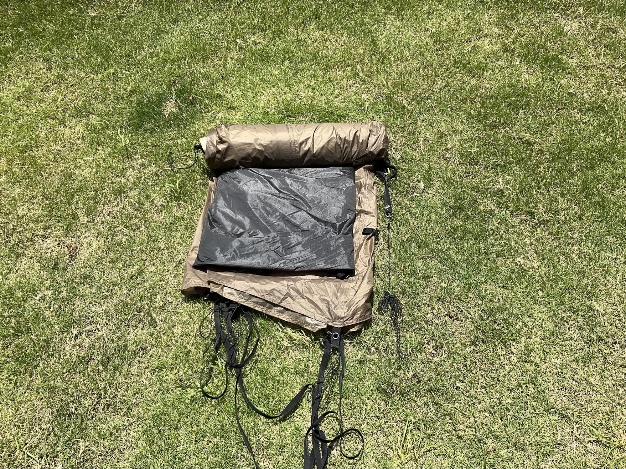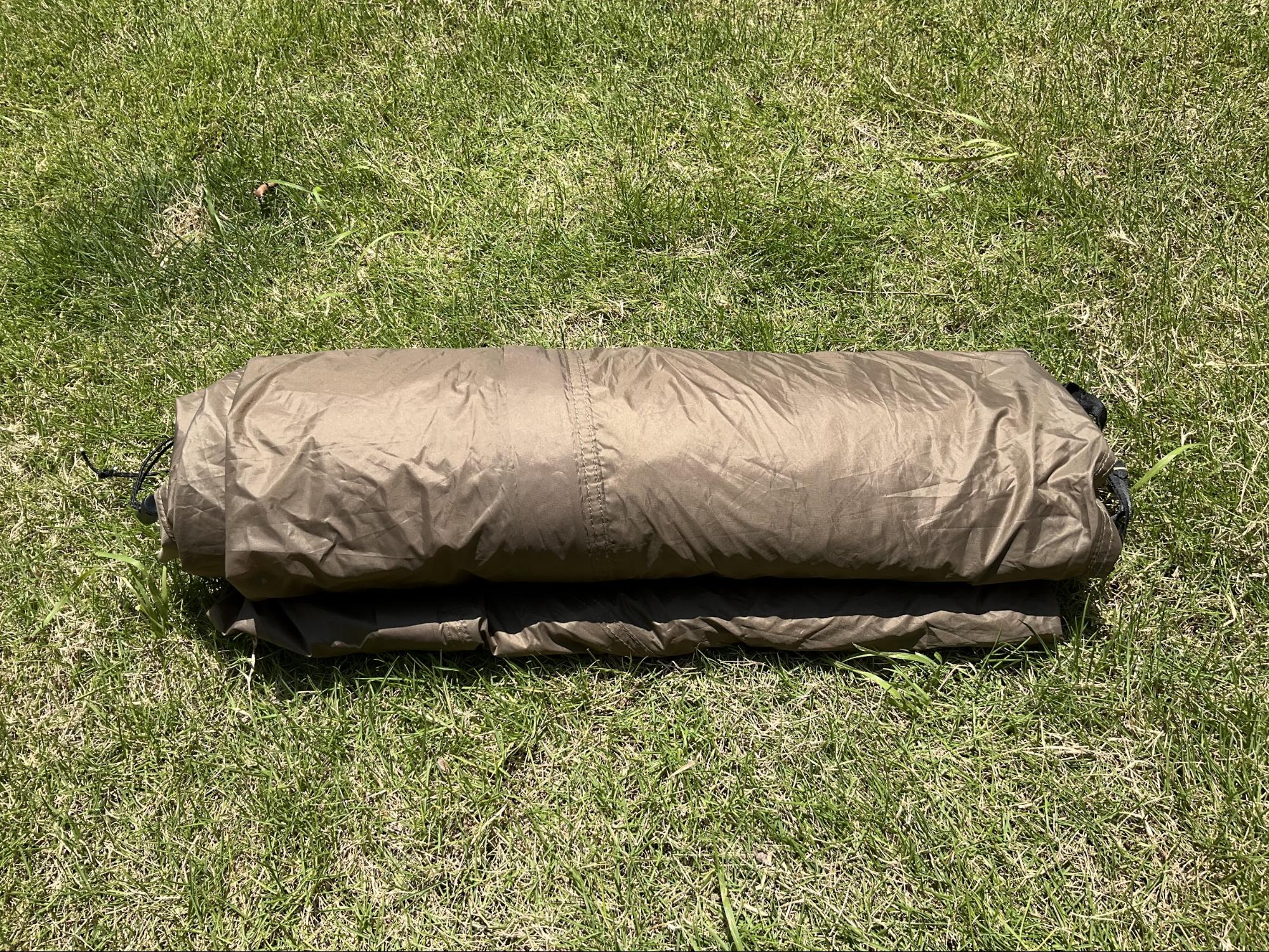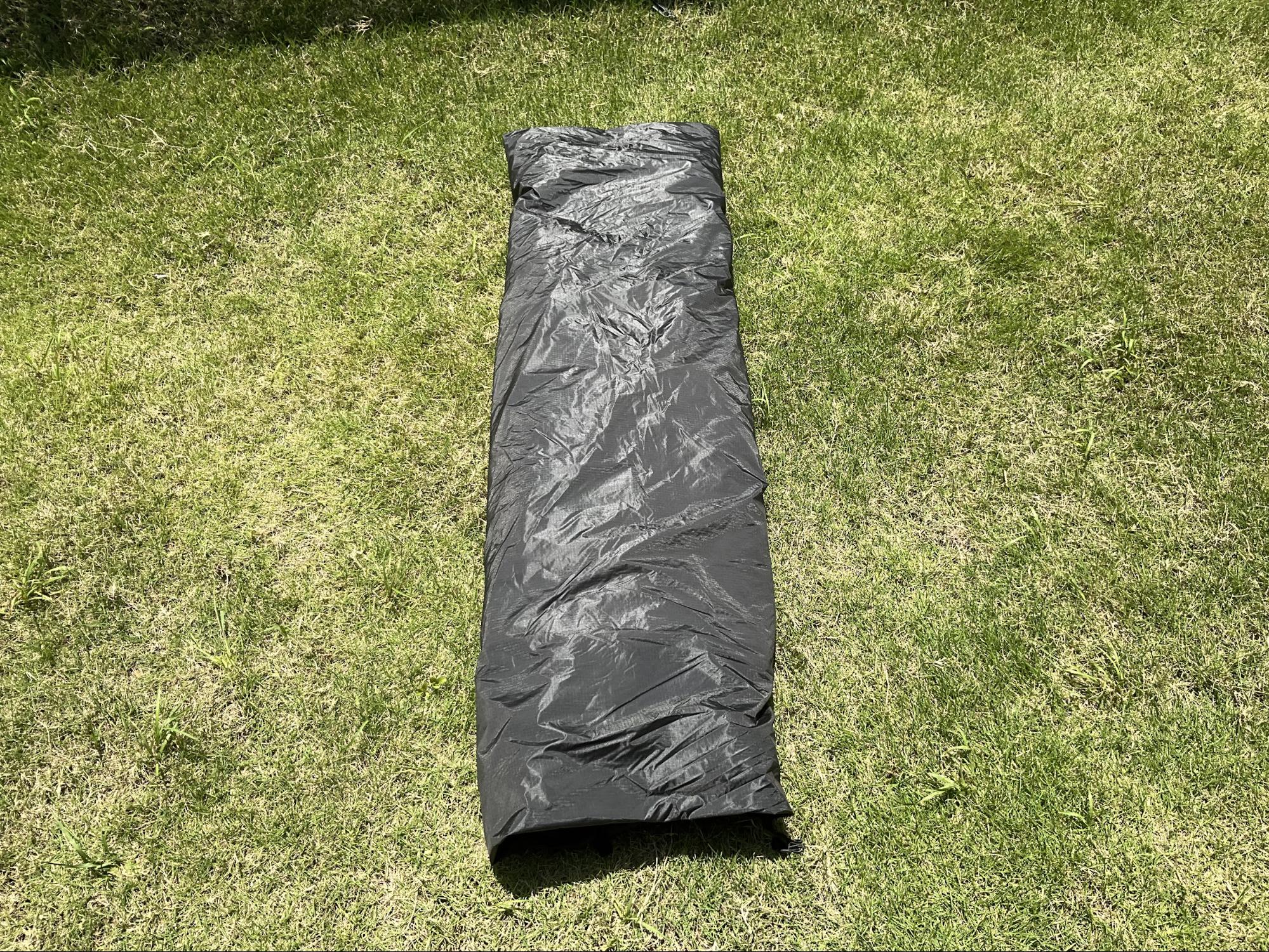 インナーテントの上にフライシートを重ねて、テントフレームを軸にして余分な空気を抜くように巻いていきます。