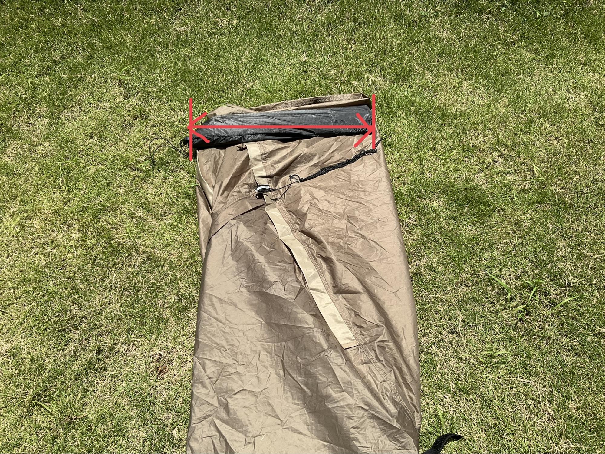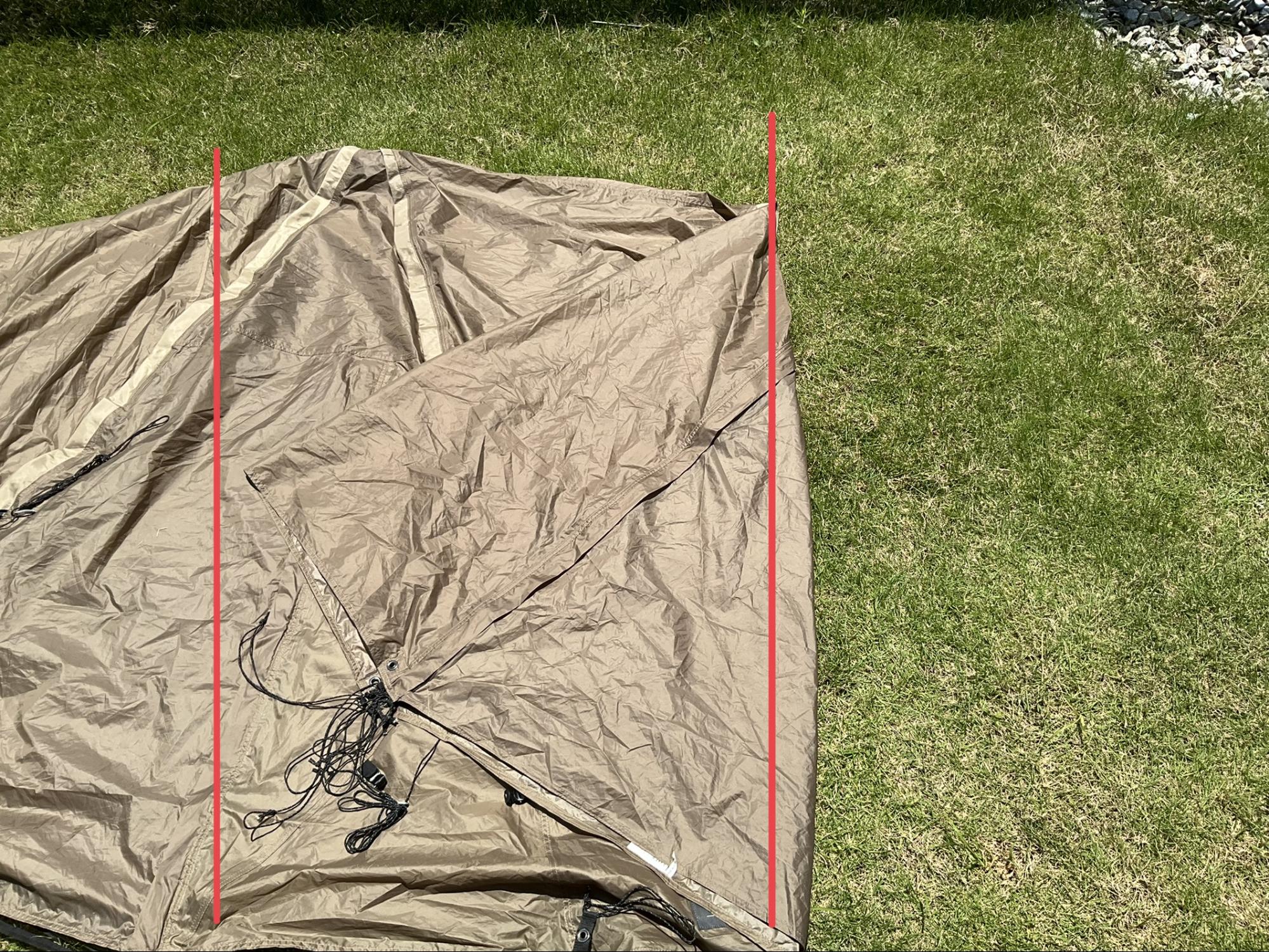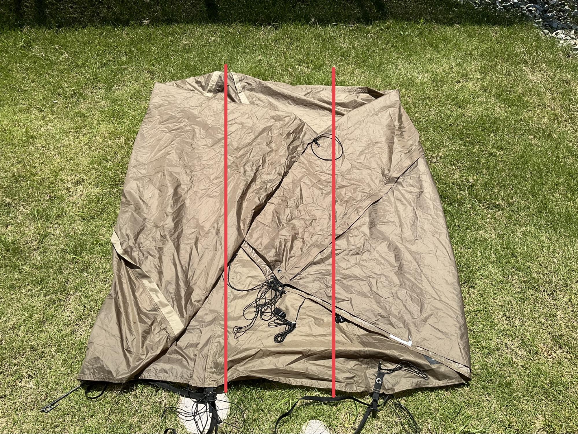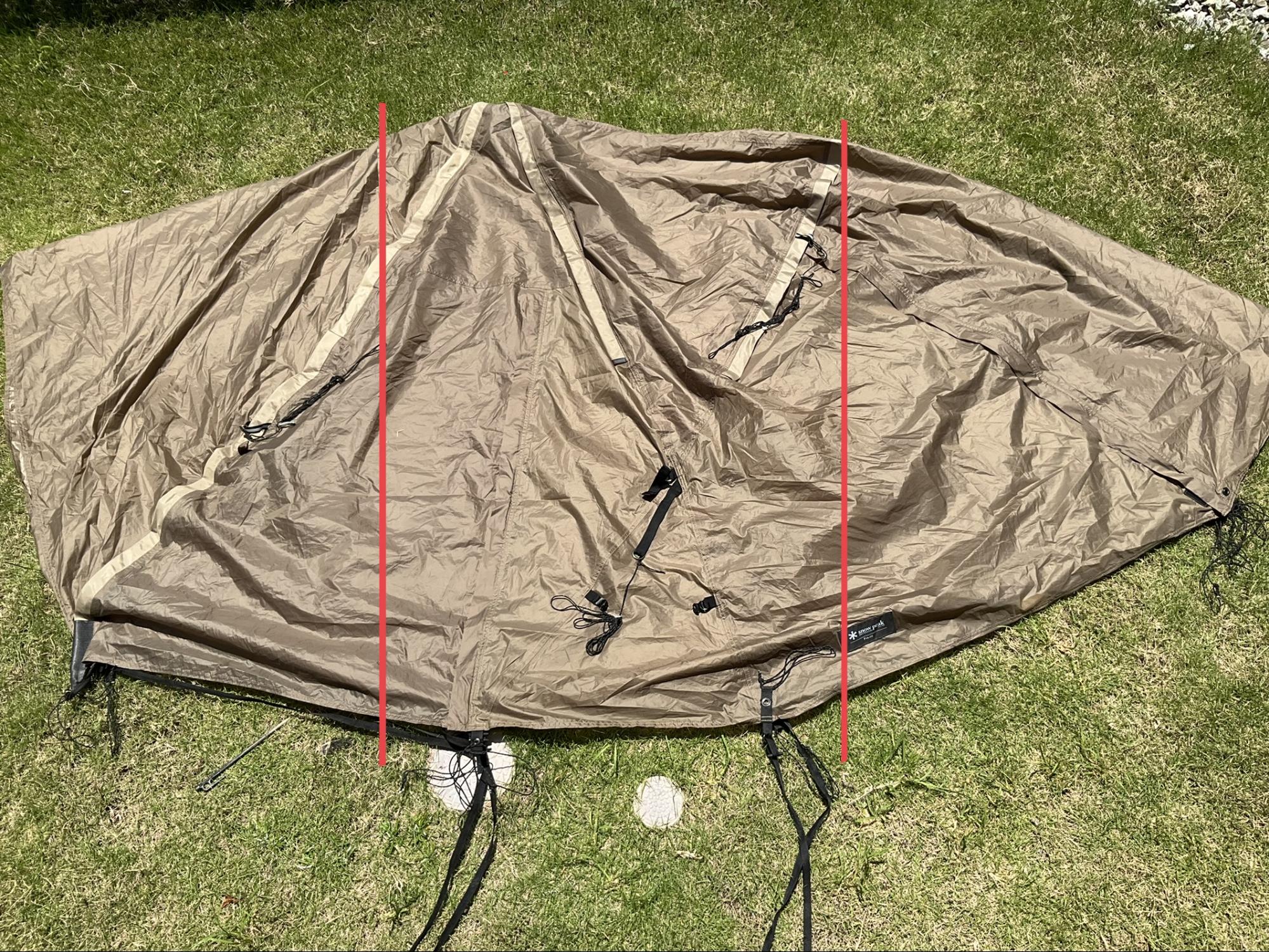 両端のとんがっている箇所をスリーブ(フレームを通すところ)を目安にしてフライシートの中央部に向かって折ります。