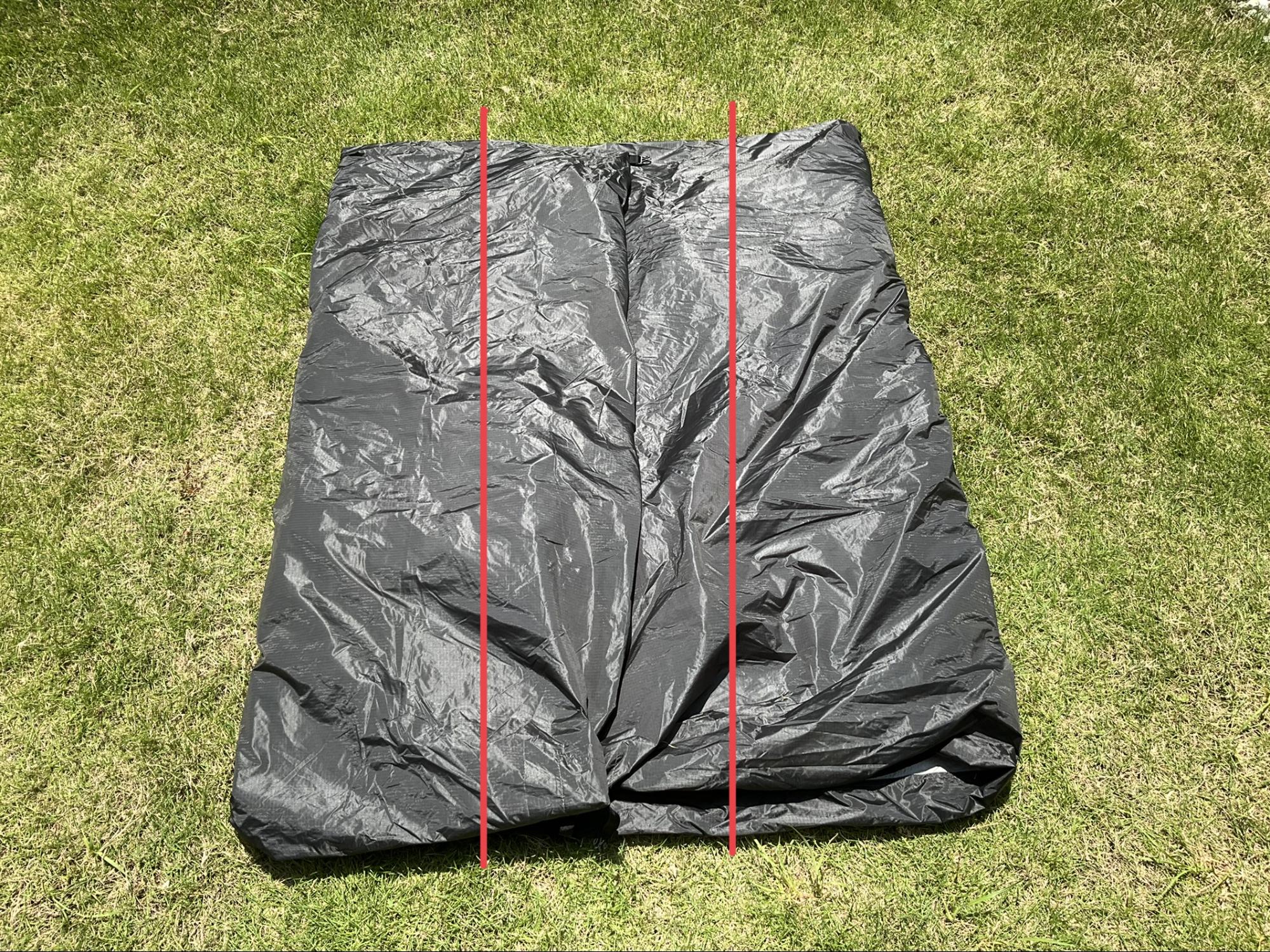 長方形の両端を中央部に向かって折りますが、このテントの場合は、サイズ的に三つ折りがよさそうですね。