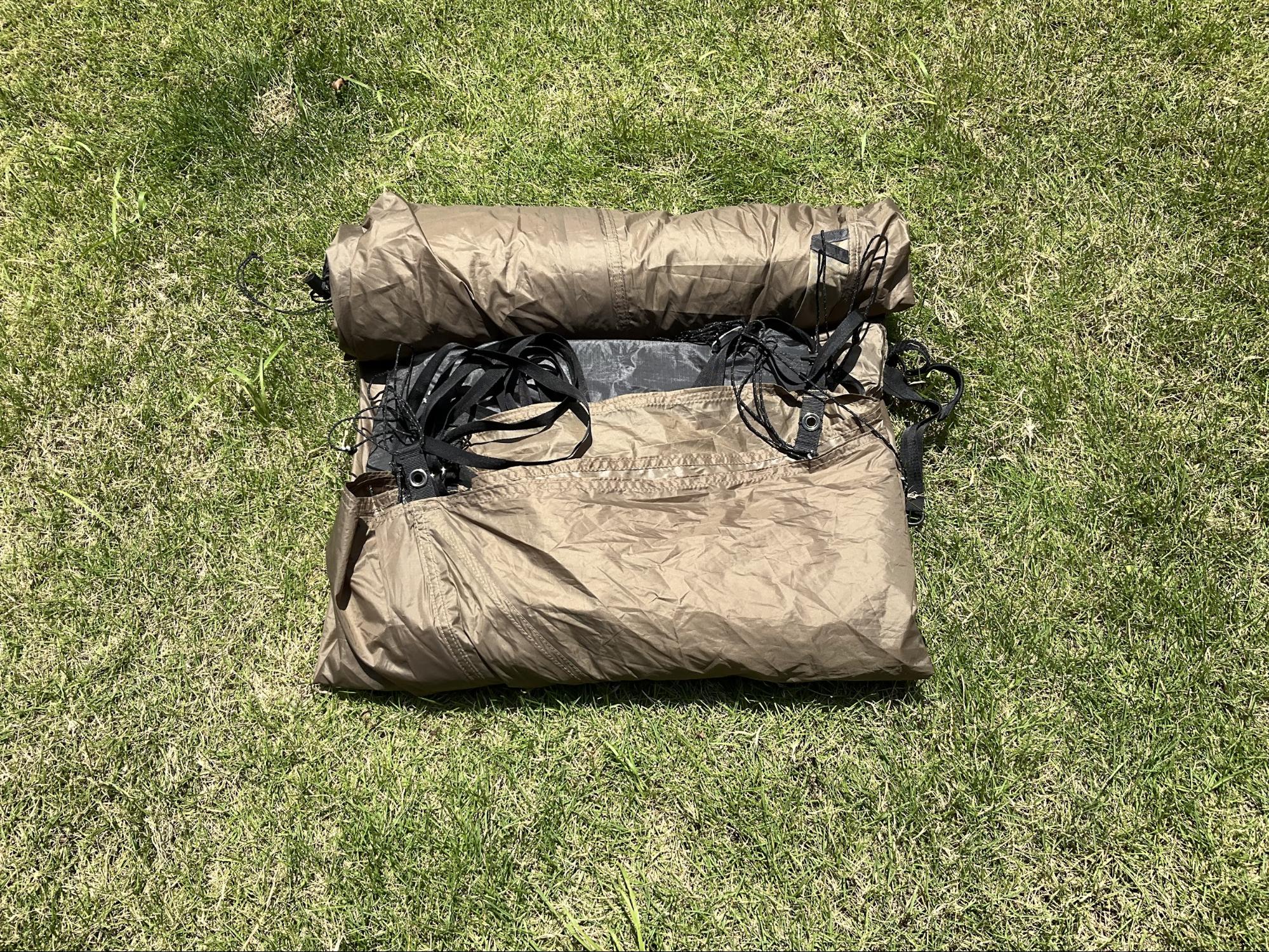 ⑥インナーテントとフライシートを重ね一緒に巻いていく