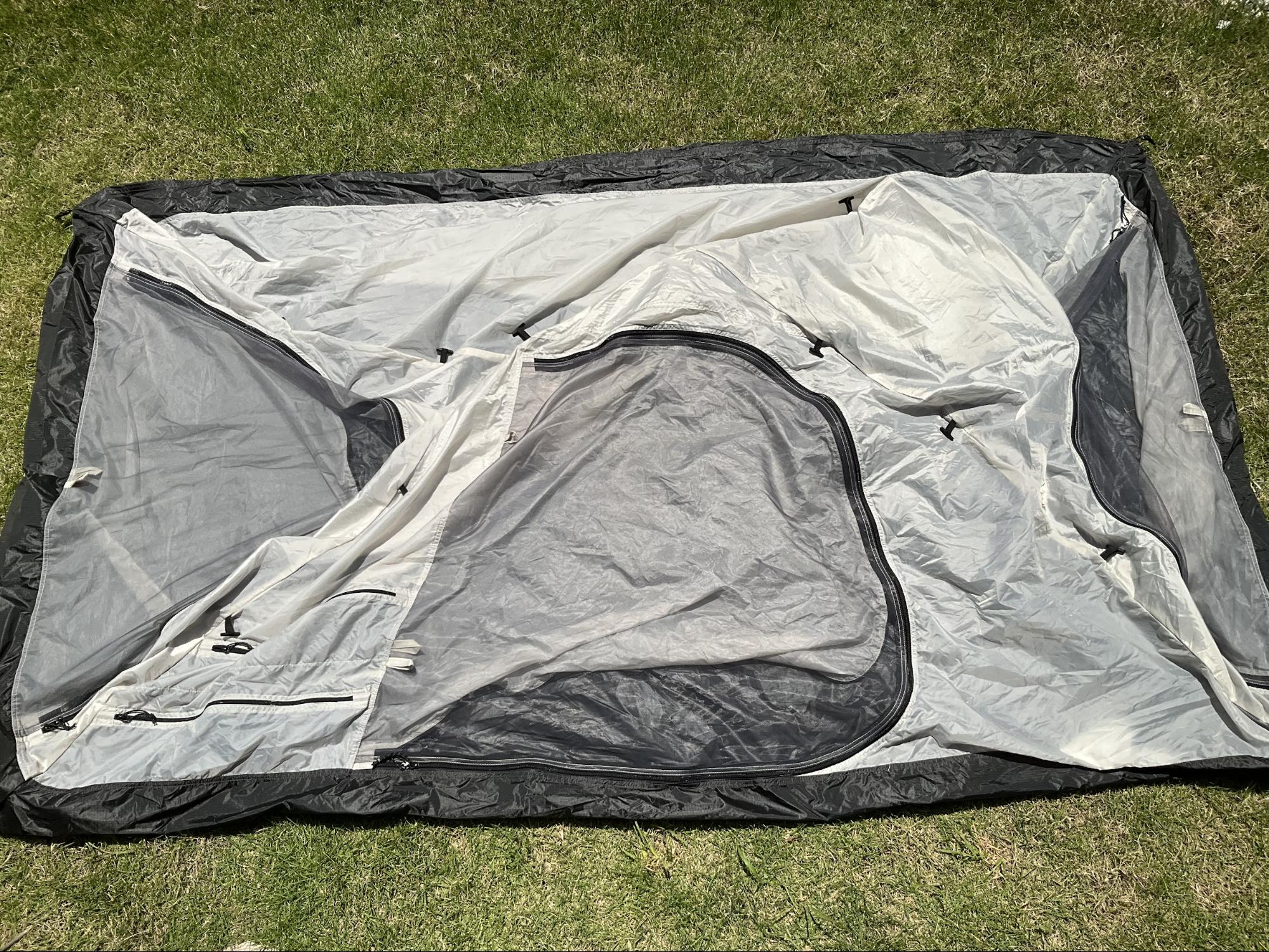 インナーテントを広げます。空気が抜けるようにファスナーは数箇所ファスナーは開けておこう!