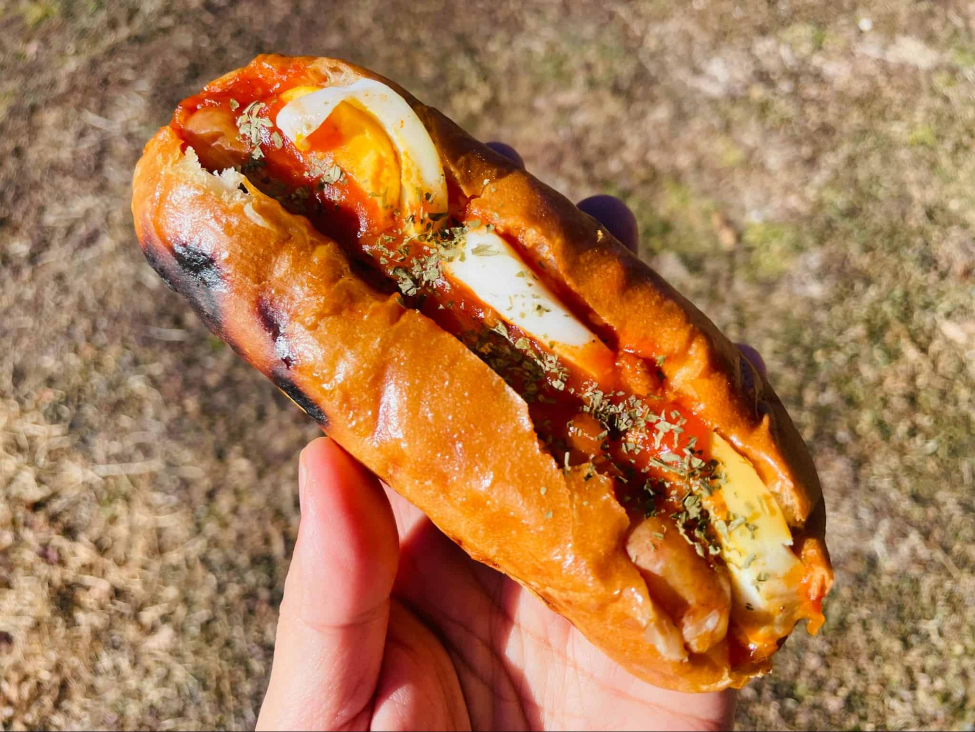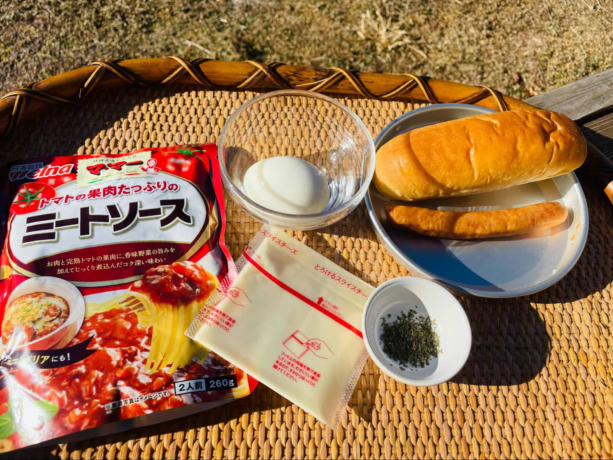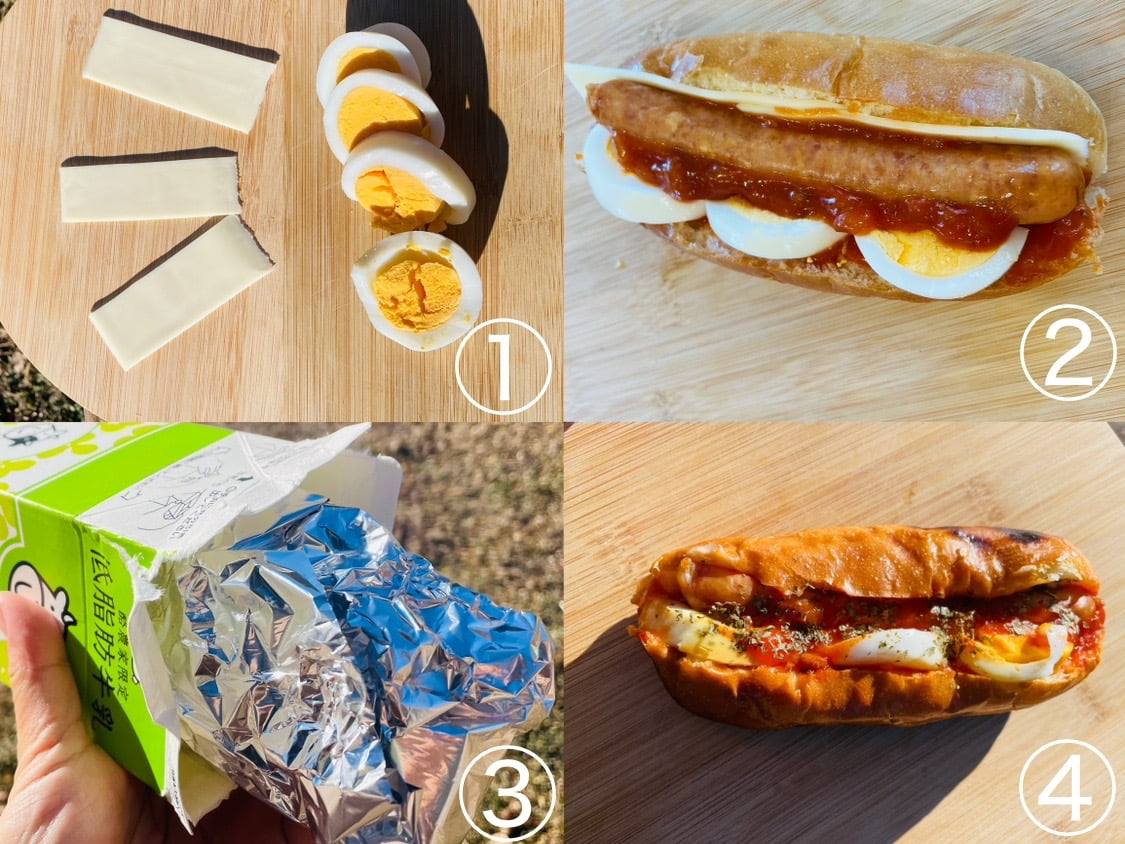 2. 切り目をいれたパンにミートソース、チーズ、卵、ソーセージの順に挟む。