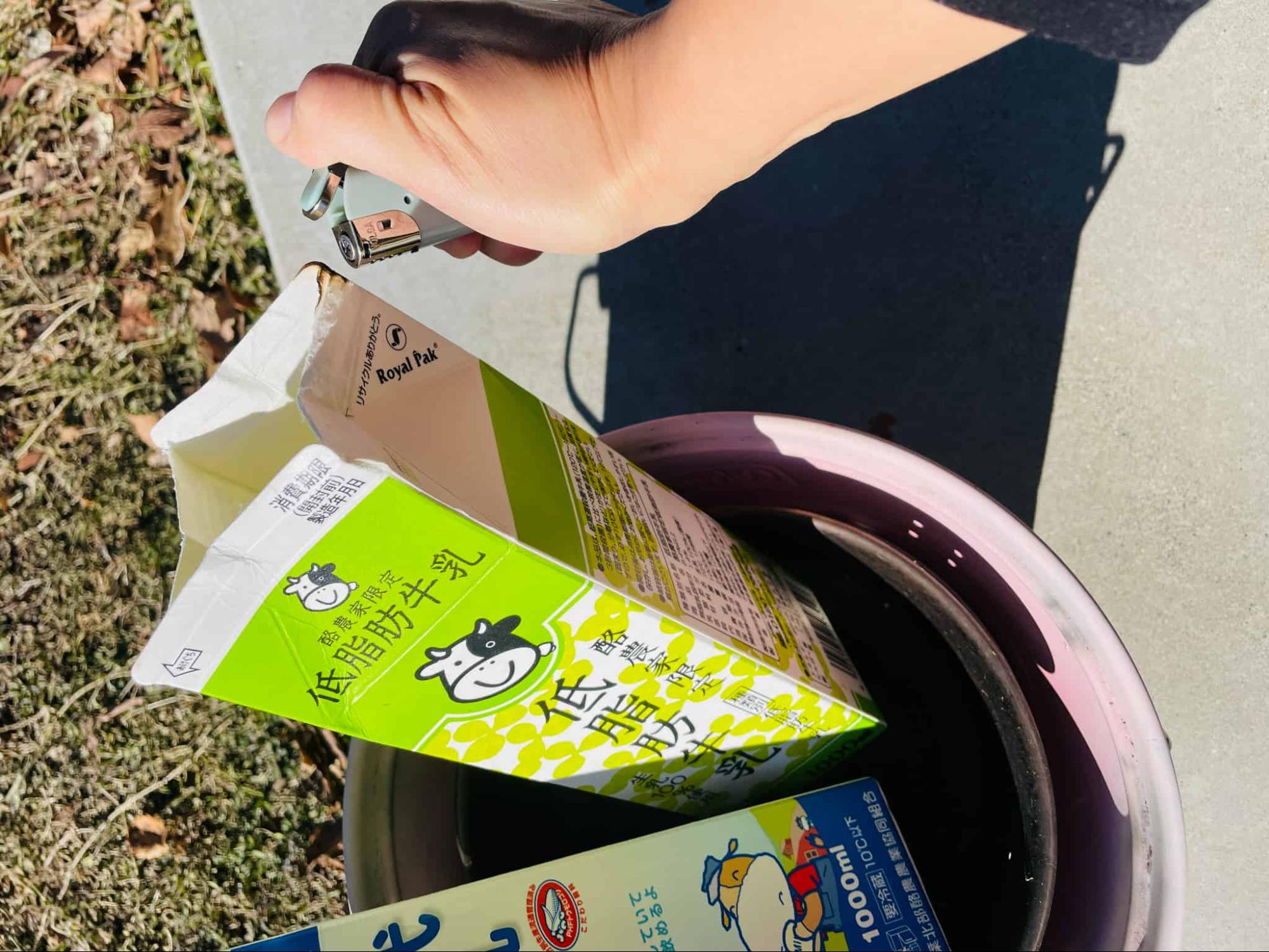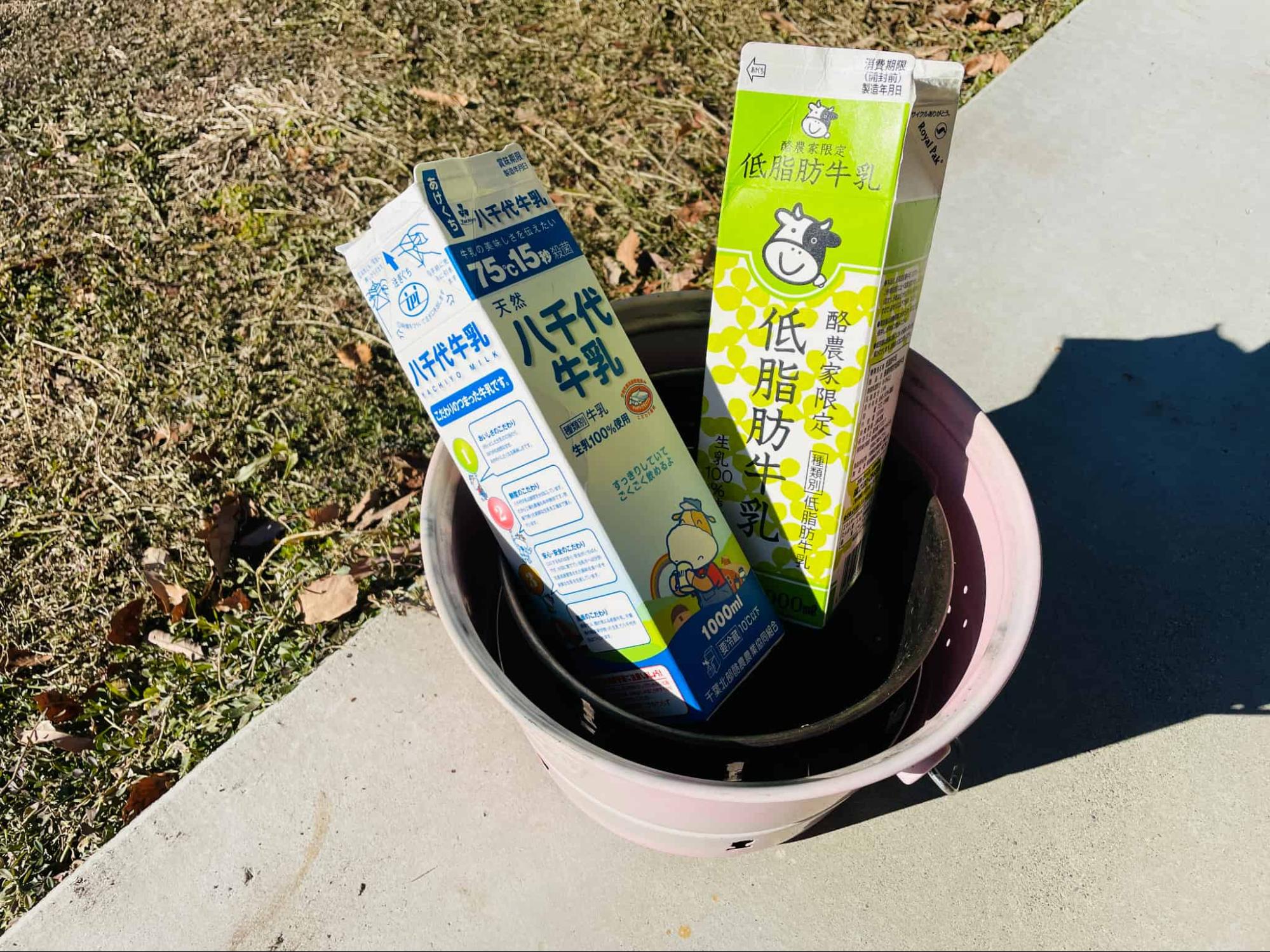 垂直に立てると、牛乳パックが燃えてきた際に中身が突然倒れてくるので危険です。