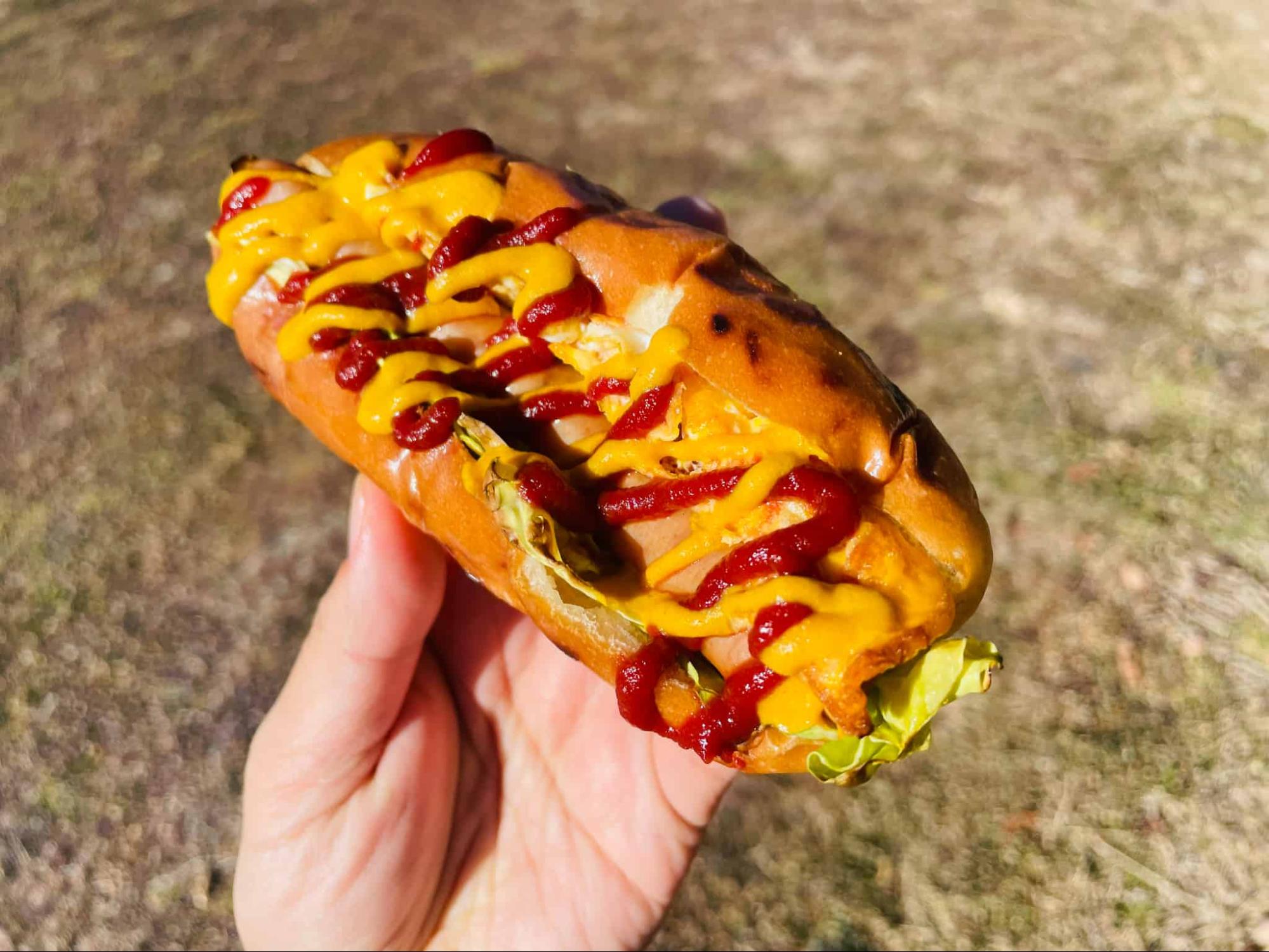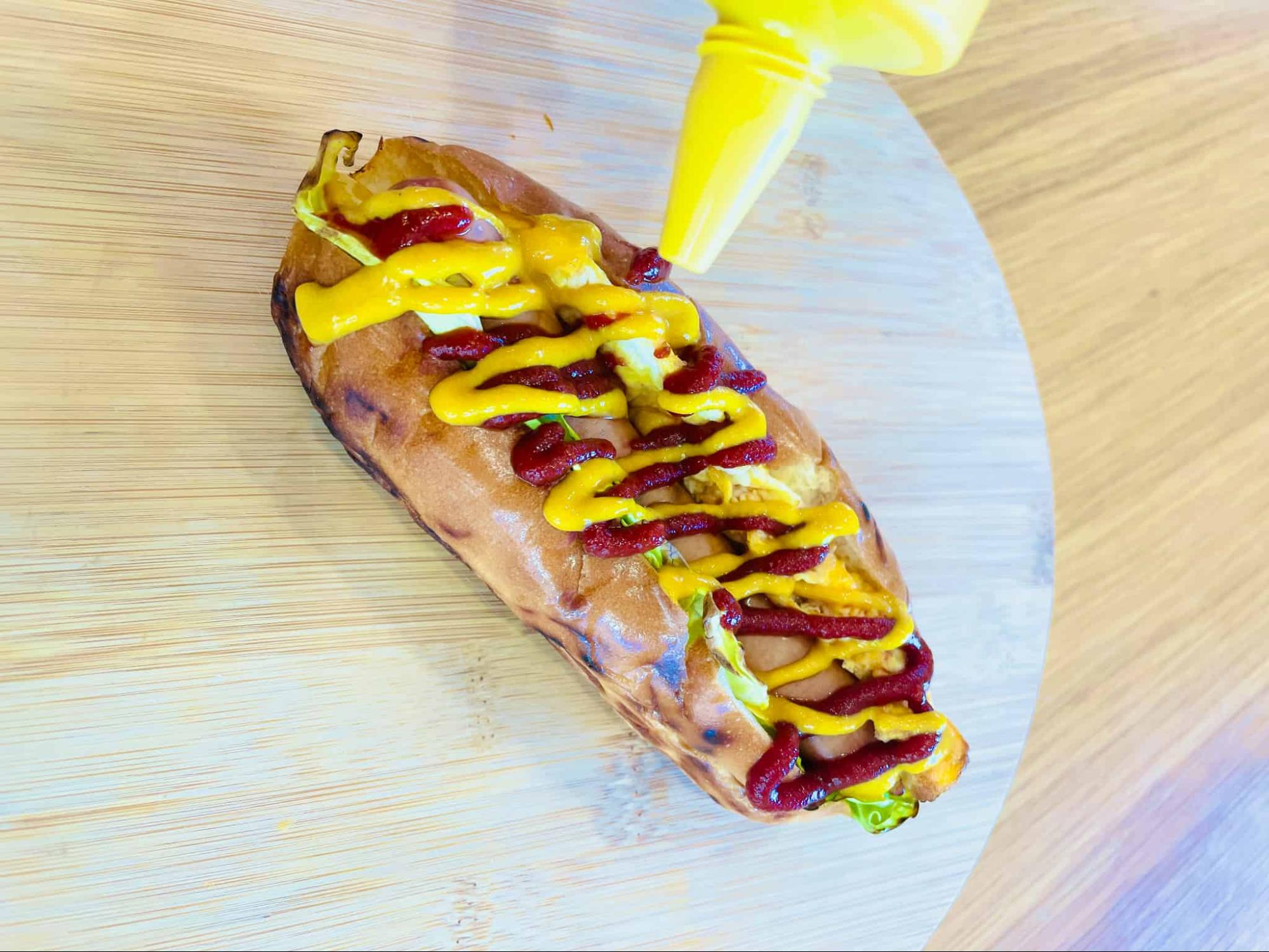 最後に、ケチャップやマスタードなどの好きなソースをかけたら、絶品カートンドッグのできあがり!